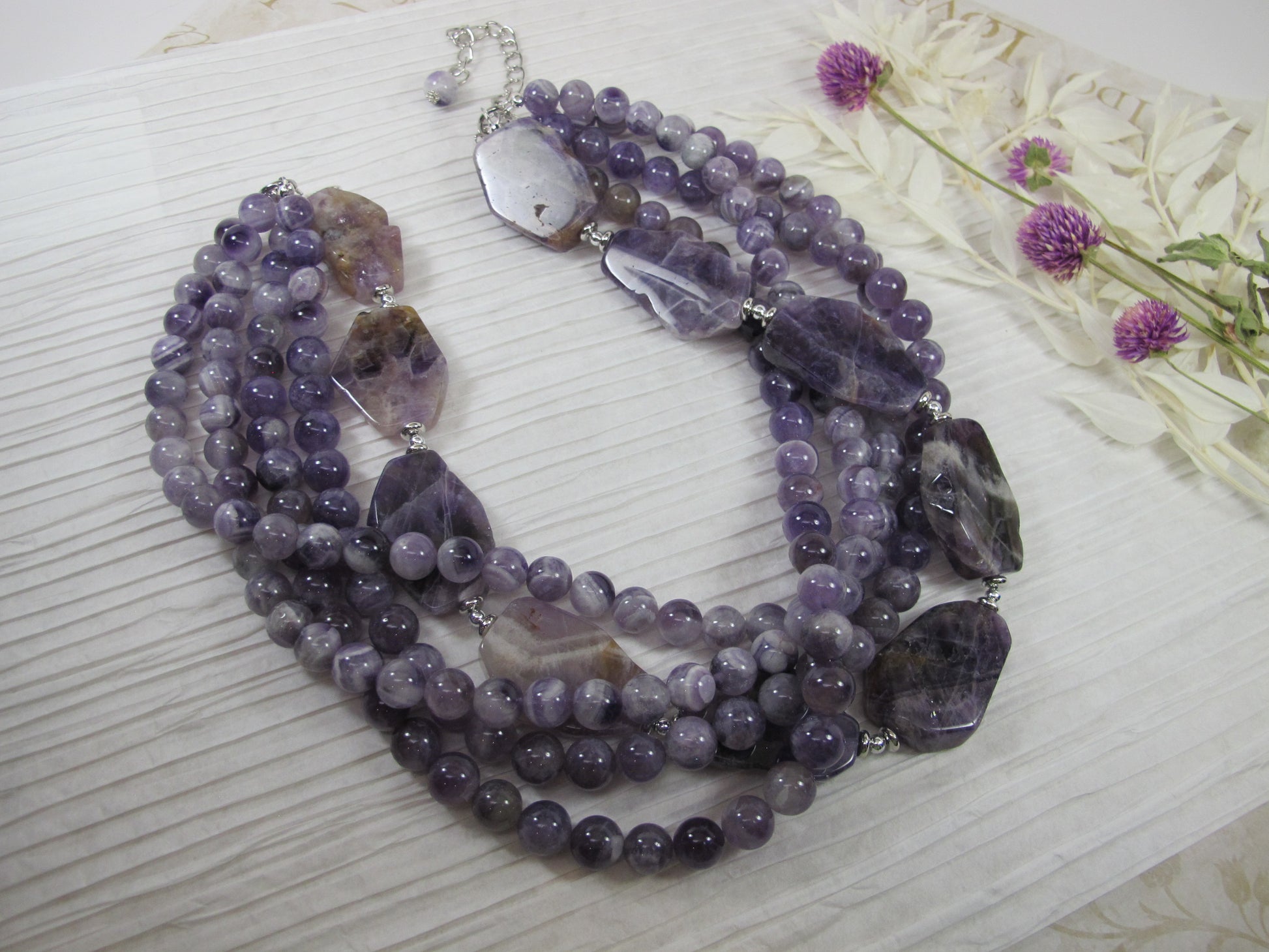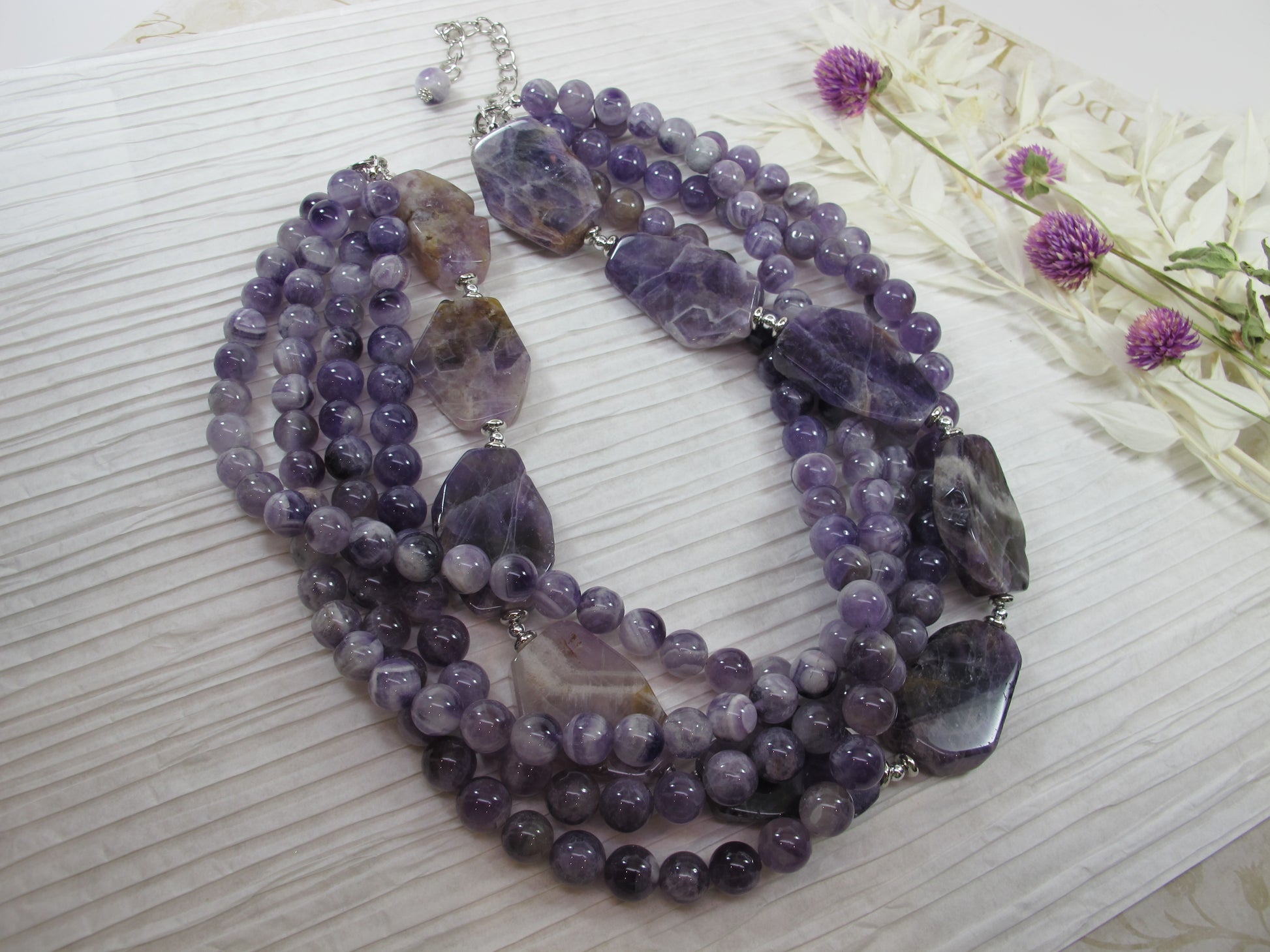 Chunky amethyst statement necklace,multi strand statement purple necklace, beaded necklace, big violet beads, amethyst statement jewelry