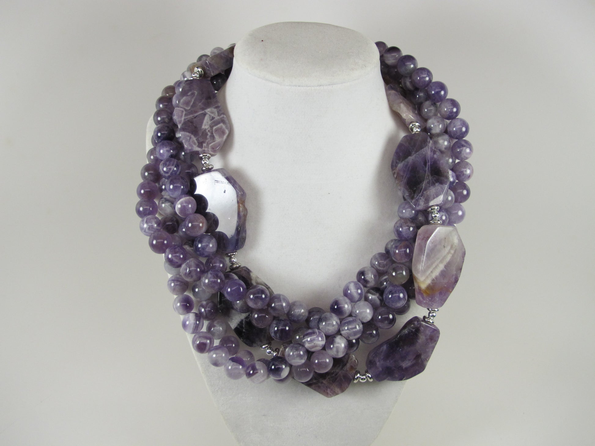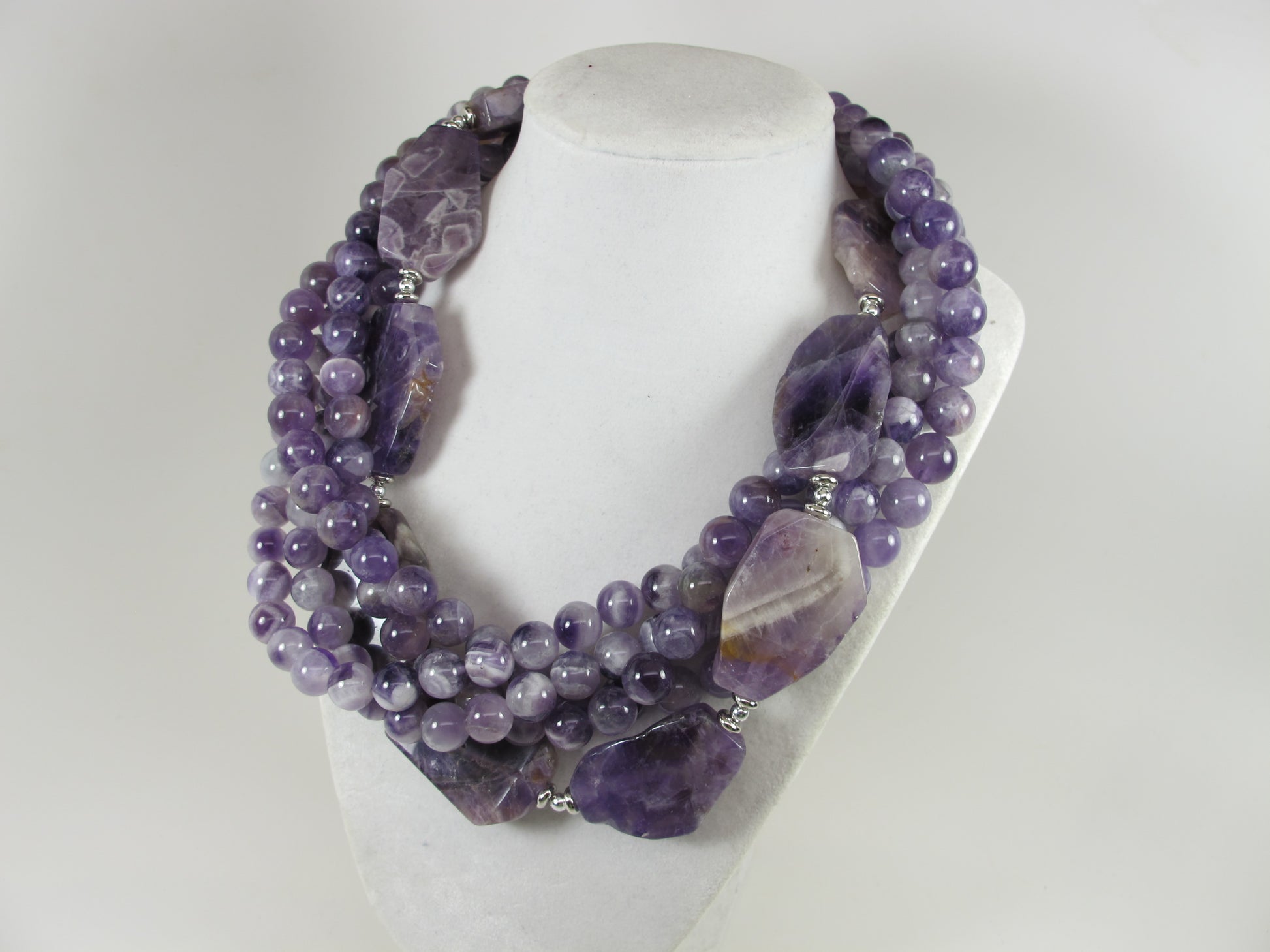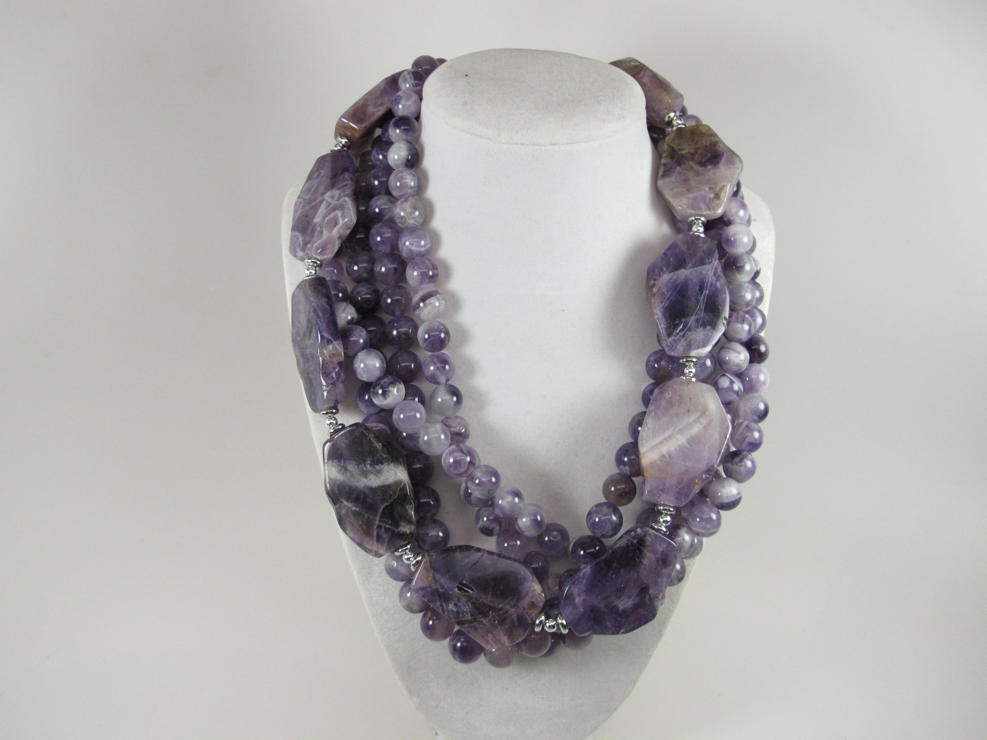 A bold and dramatic statement necklace featuring genuine round amethyst beads 10 mm and huge amethyst beads 20mm x 40. 5 strands, very ELEGANT! HEAVY!