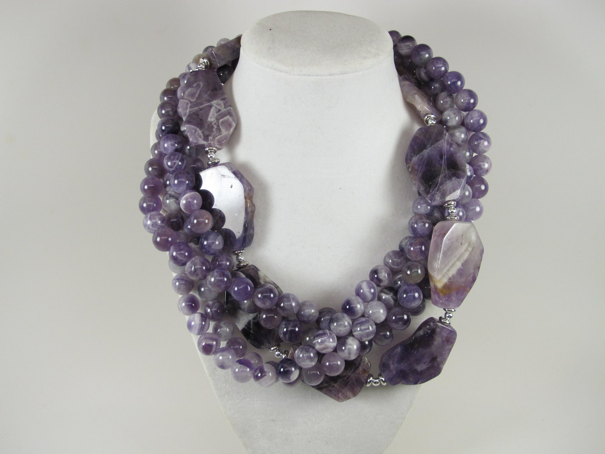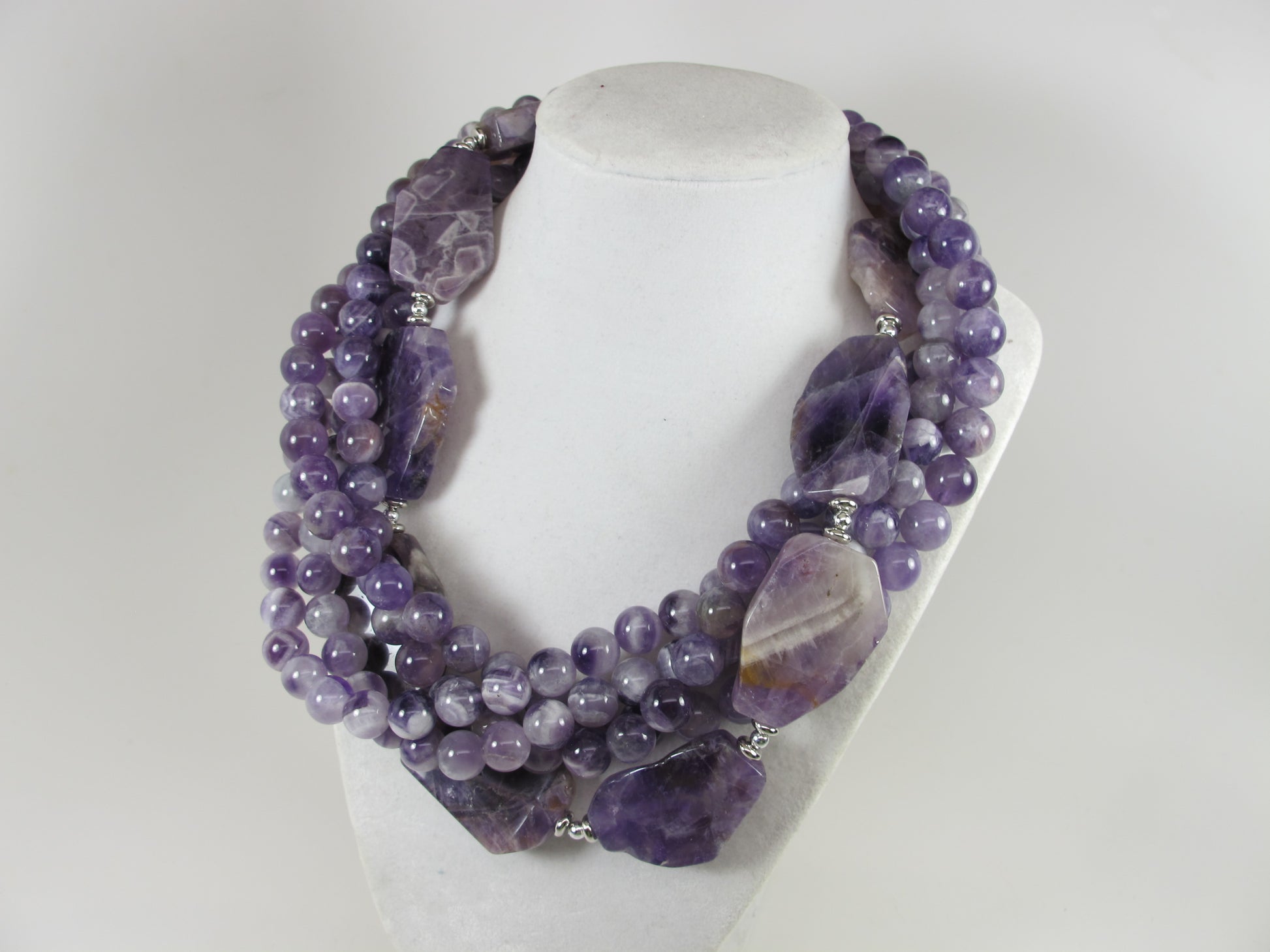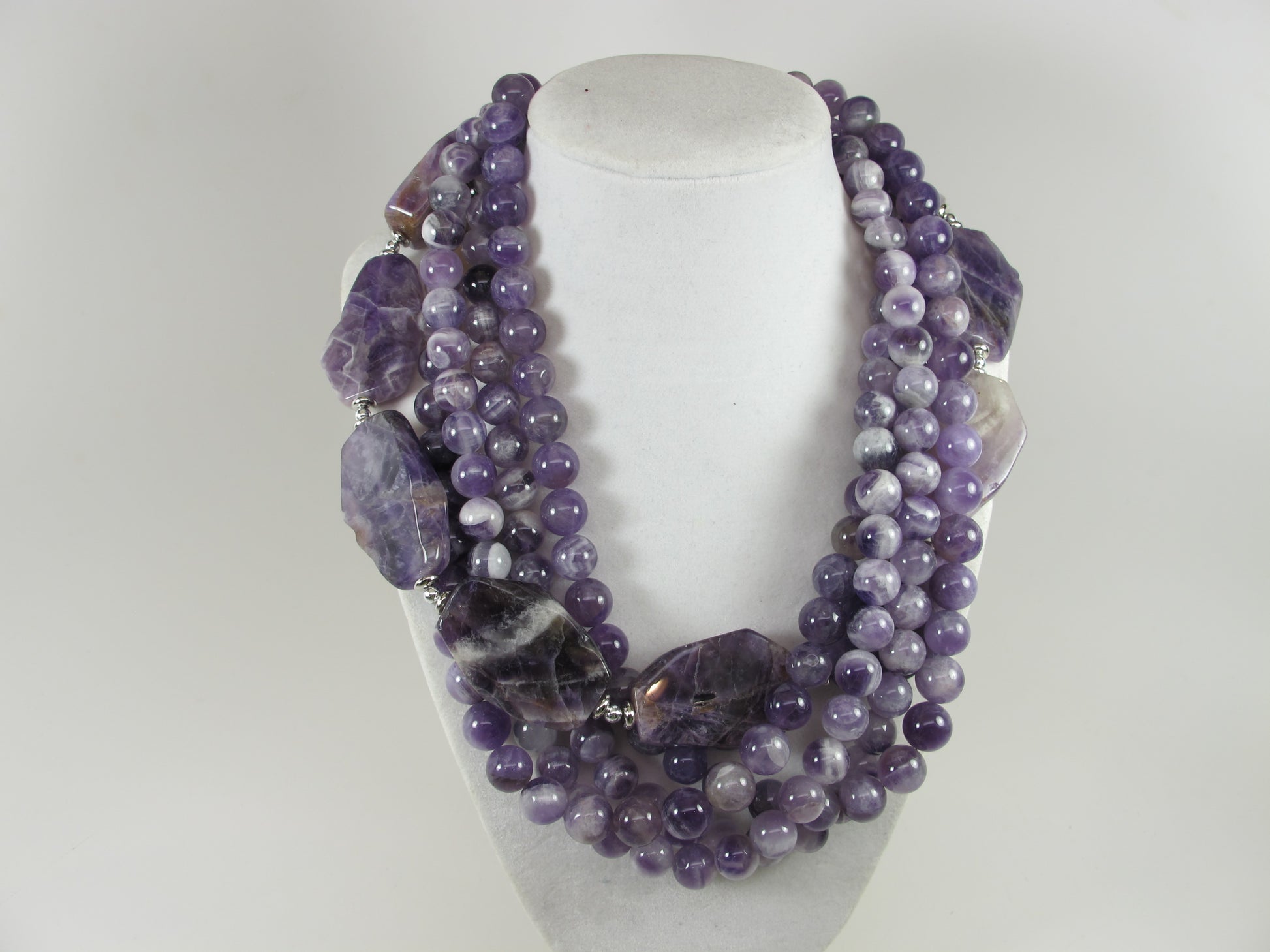 A bold and dramatic statement necklace featuring genuine round amethyst beads 10 mm and huge amethyst beads 20mm x 40. 5 strands, very ELEGANT! HEAVY!