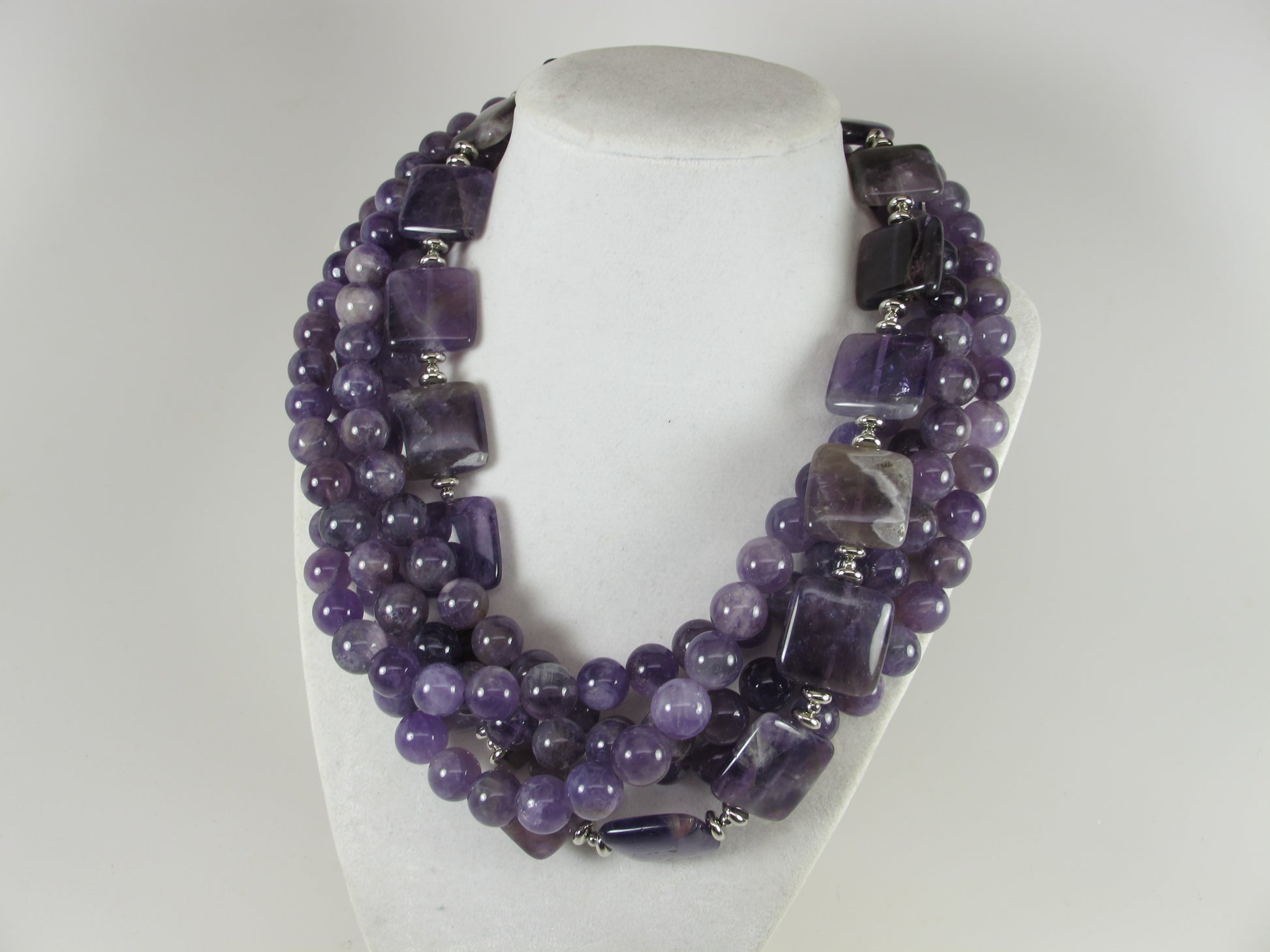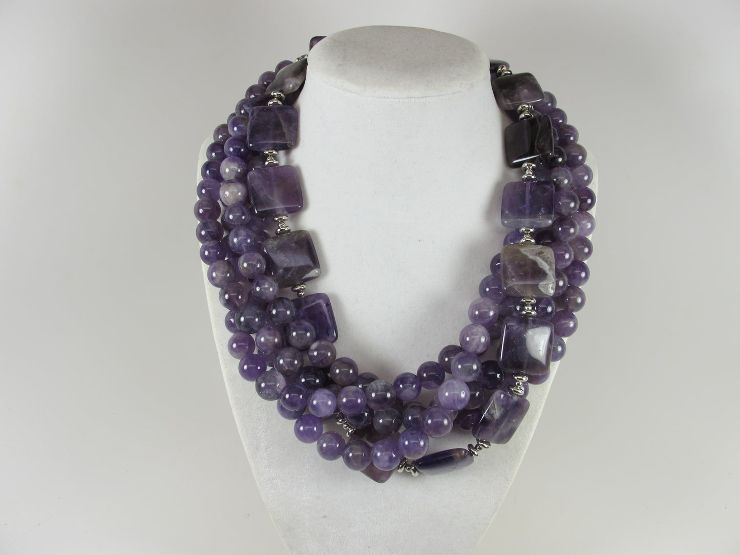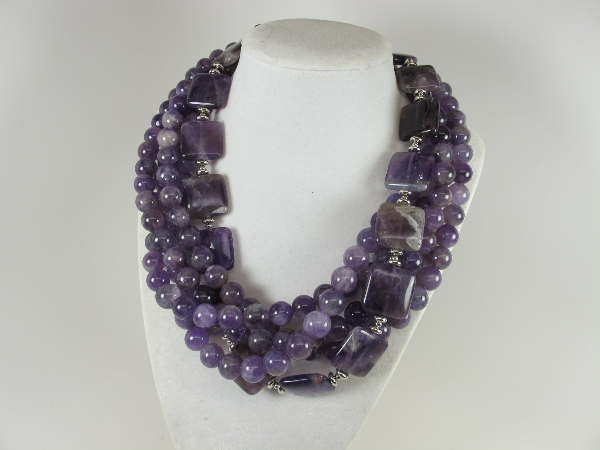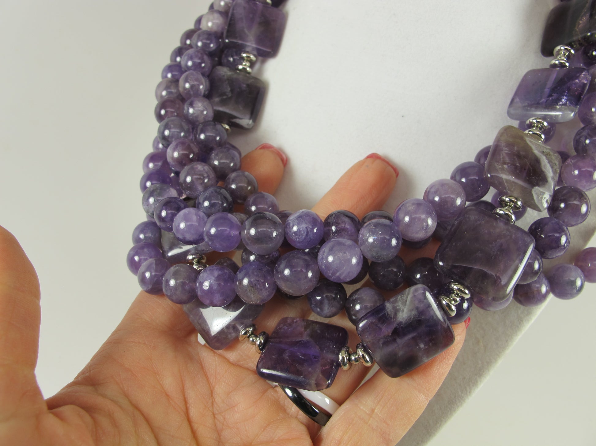 A bold and dramatic statement necklace featuring genuine round amethyst beads 10 mm and square amethyst beads 20mm x 20mm. 5 strands, very ELEGANT! HEAVY!