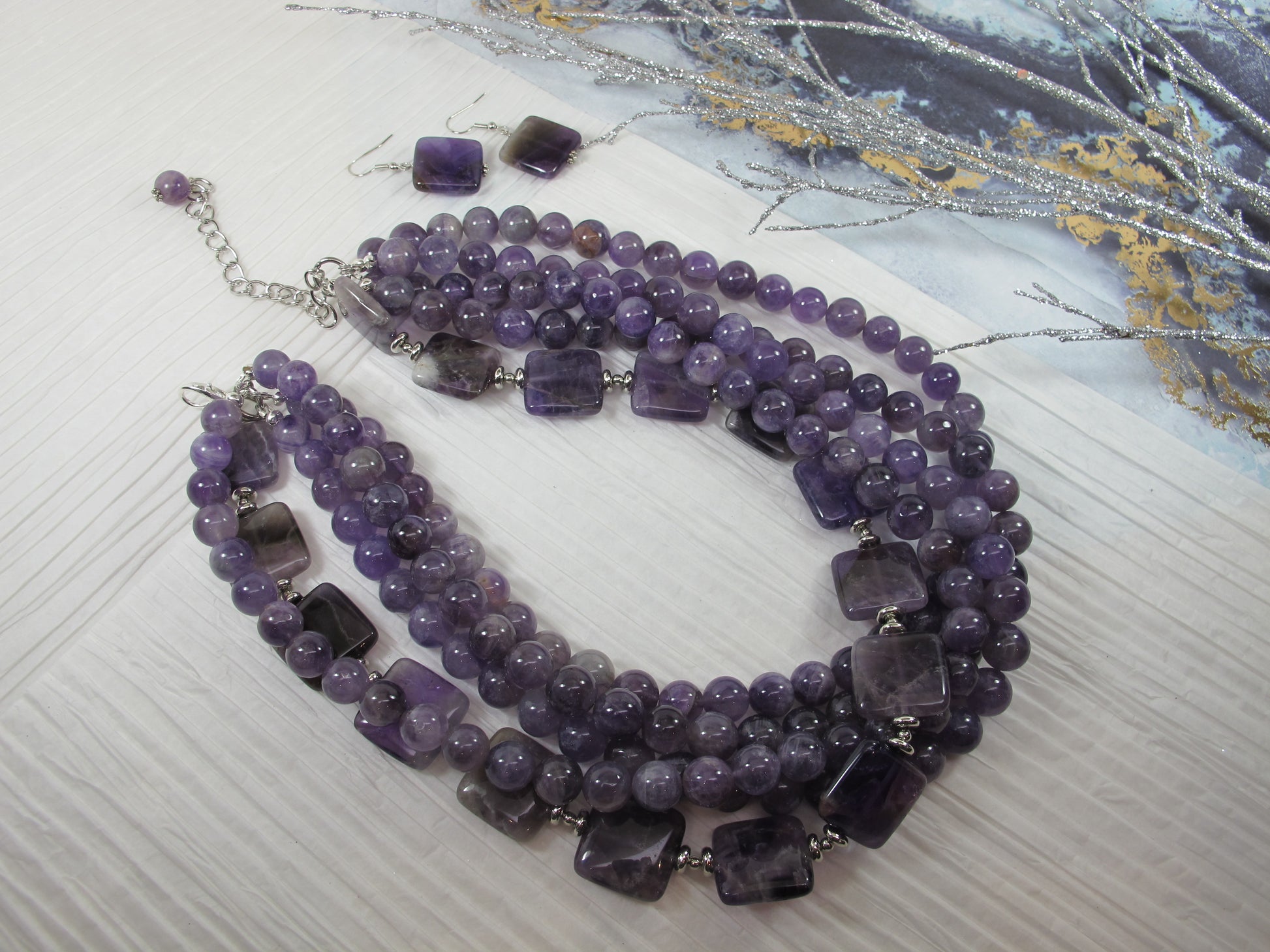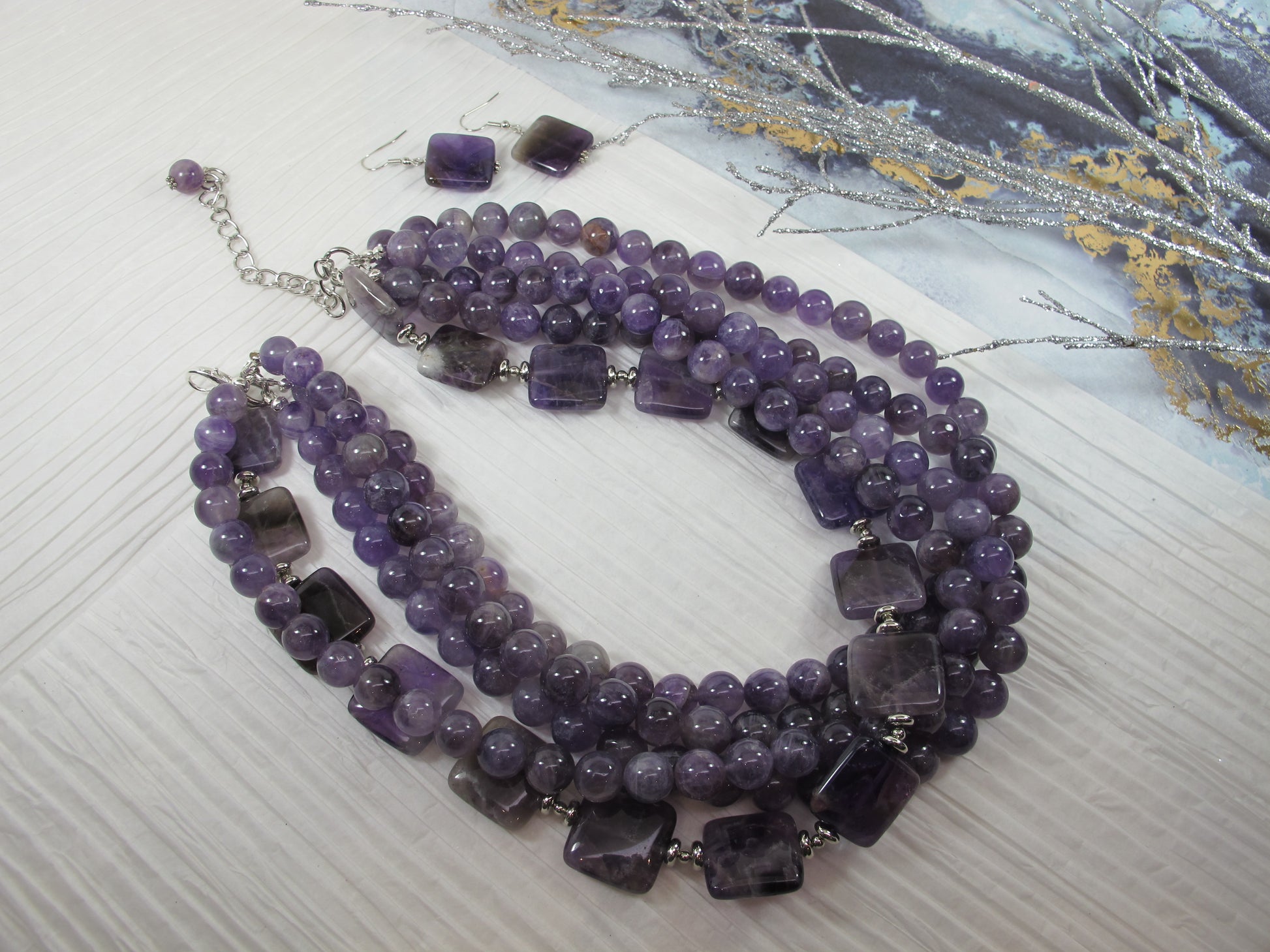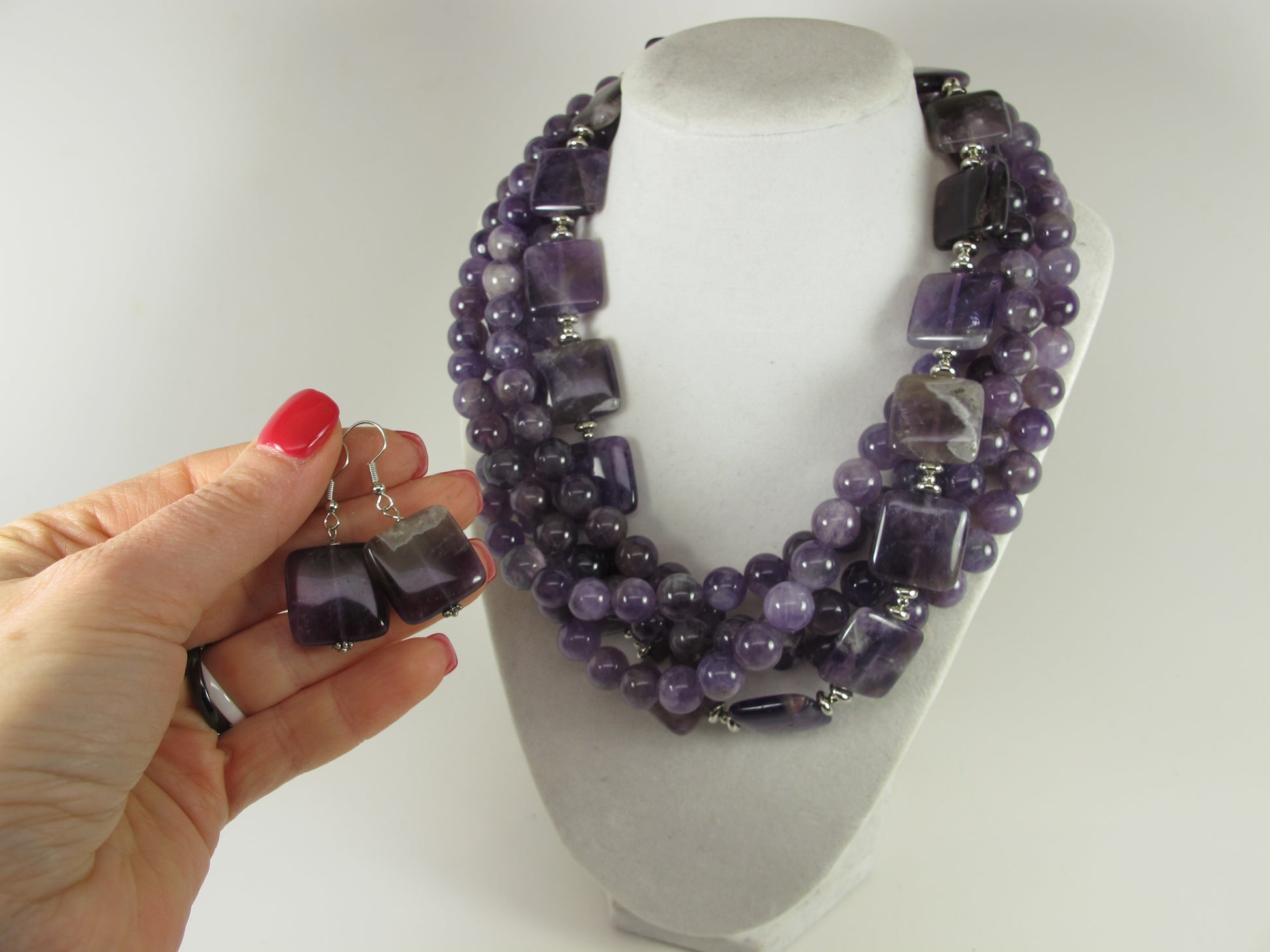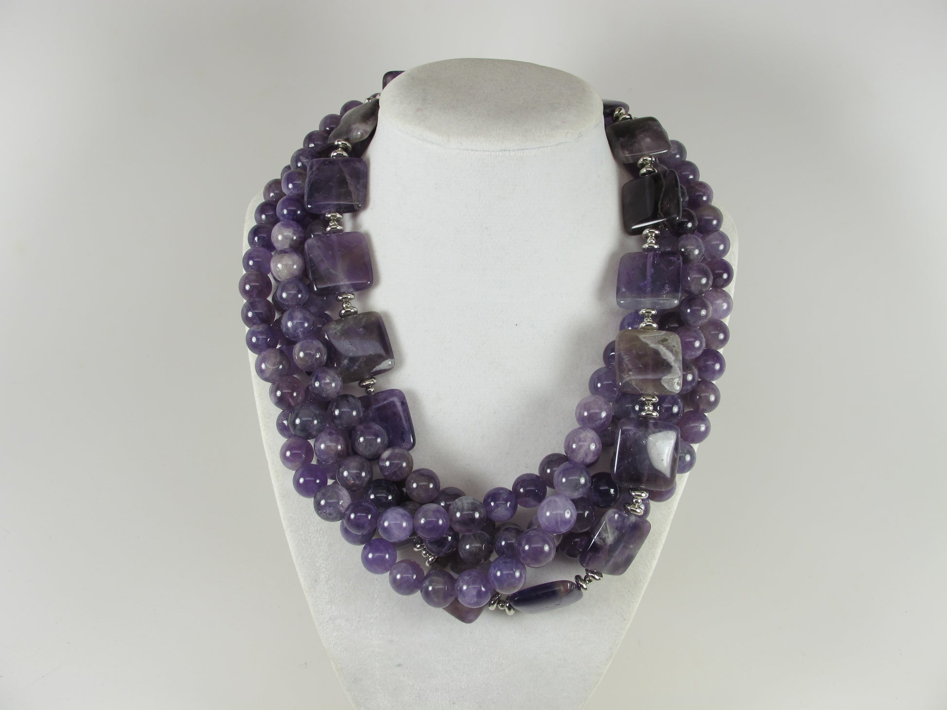 A bold and dramatic statement necklace featuring genuine round amethyst beads 10 mm and square amethyst beads 20mm x 20mm. 5 strands, very ELEGANT! HEAVY!