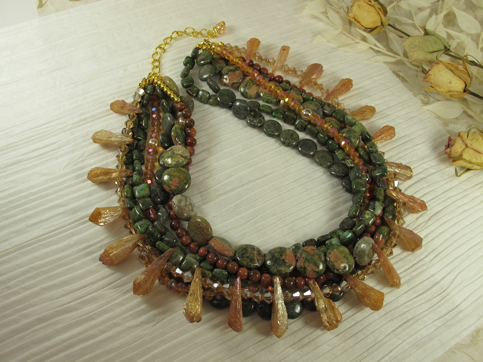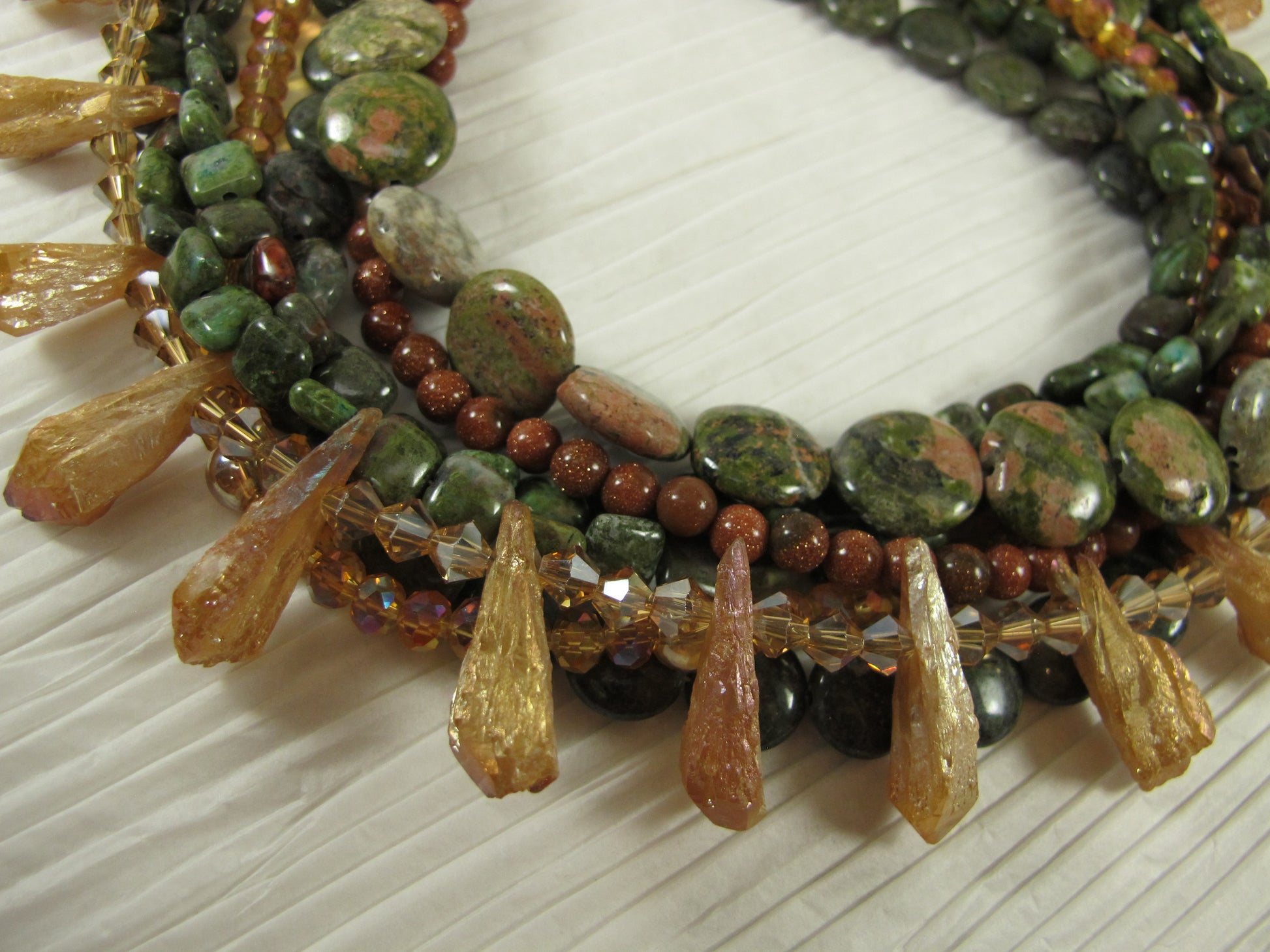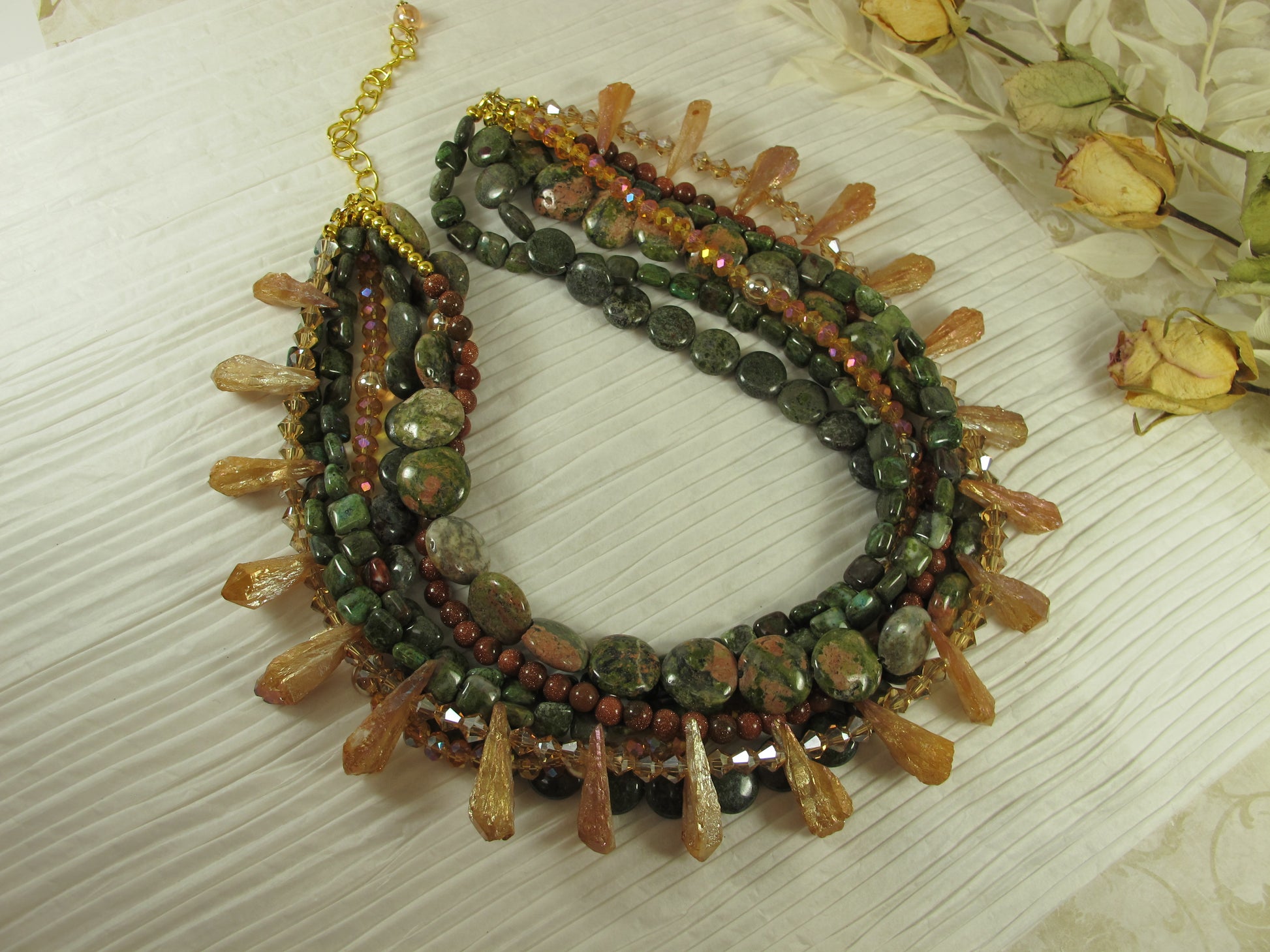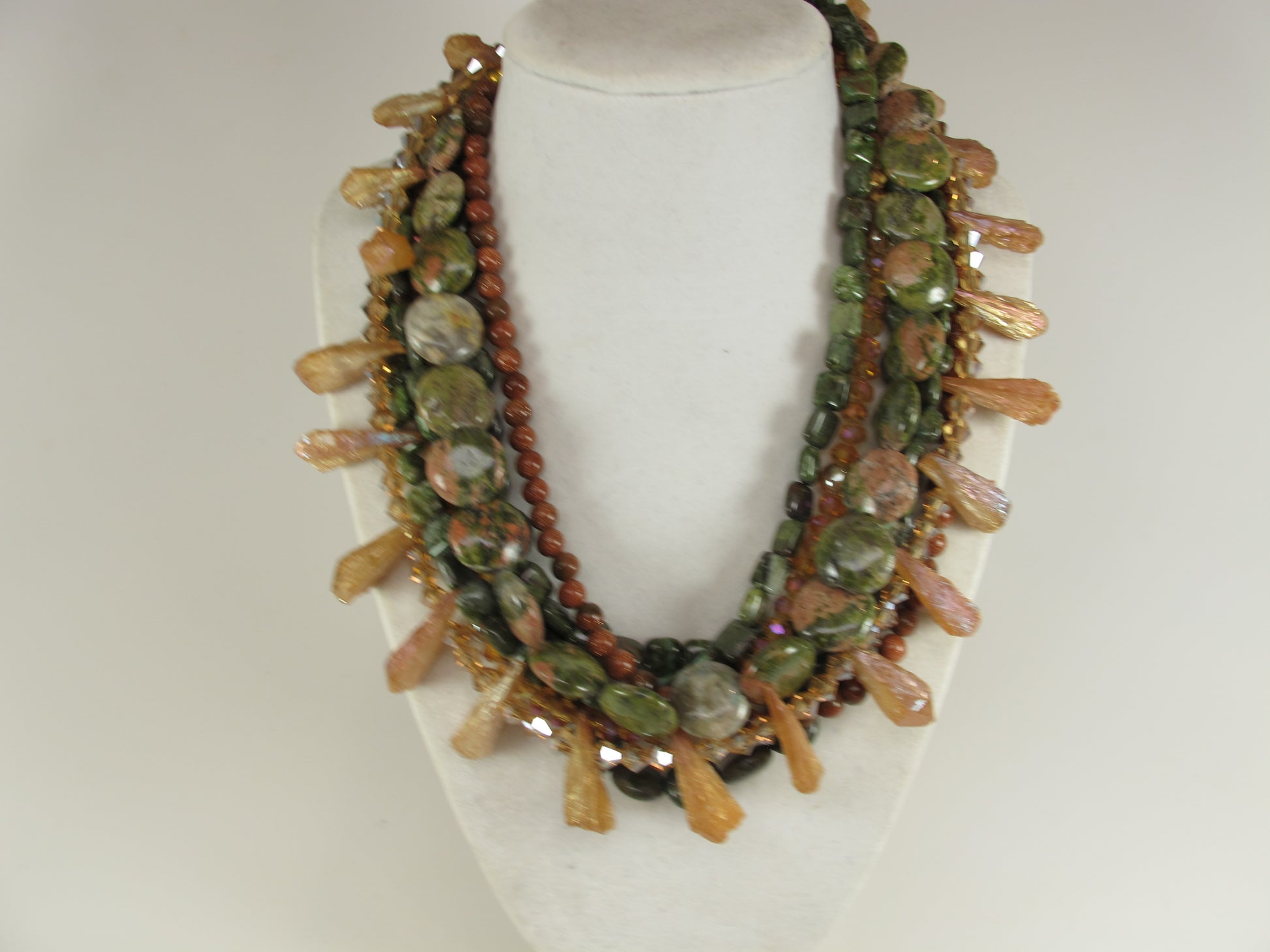 Chunky Green Agate Necklace, Green and brown Necklace, Green Brown Gold Beaded Necklace, Multi Strand Green and GoldStatement Necklace