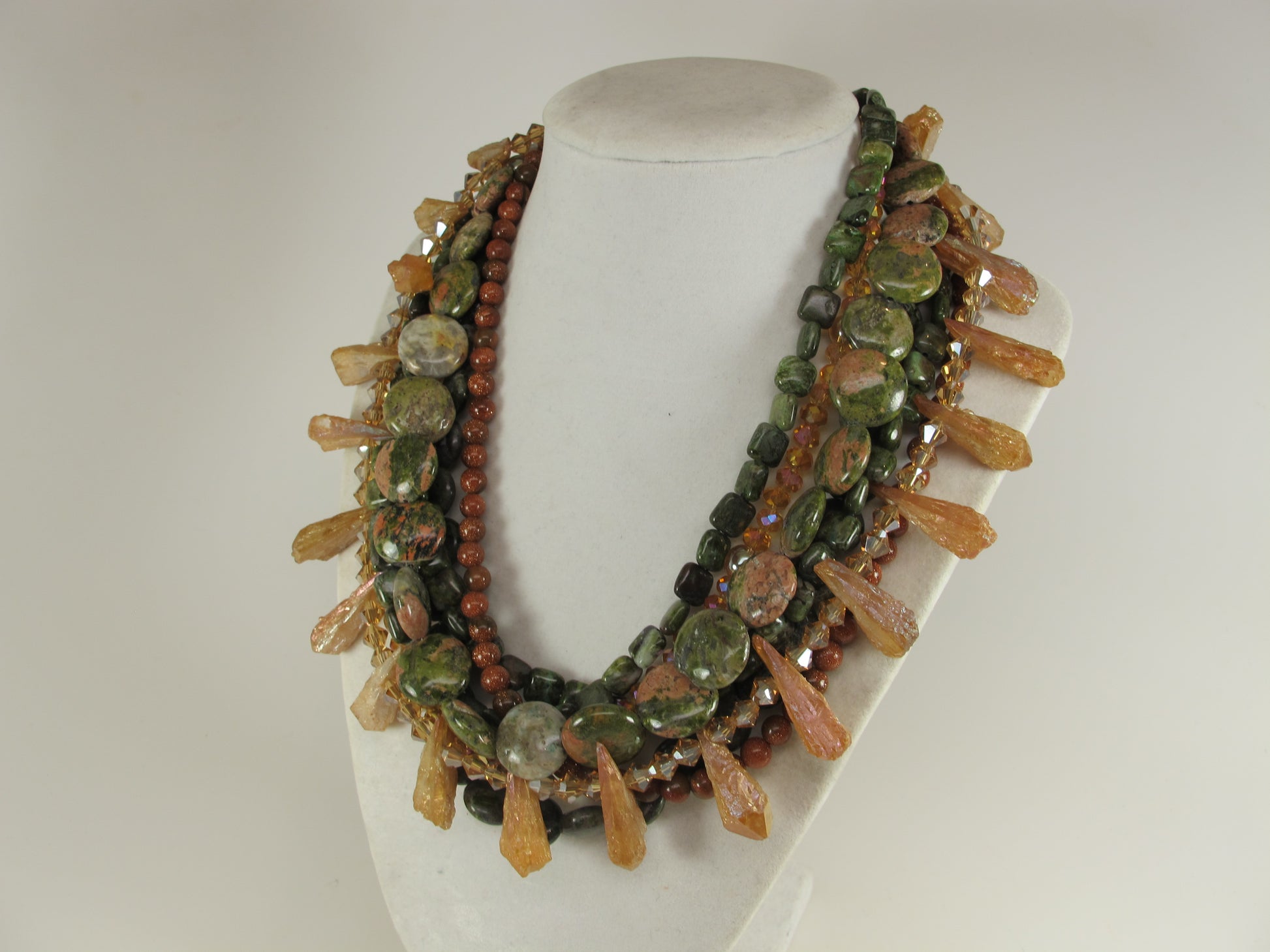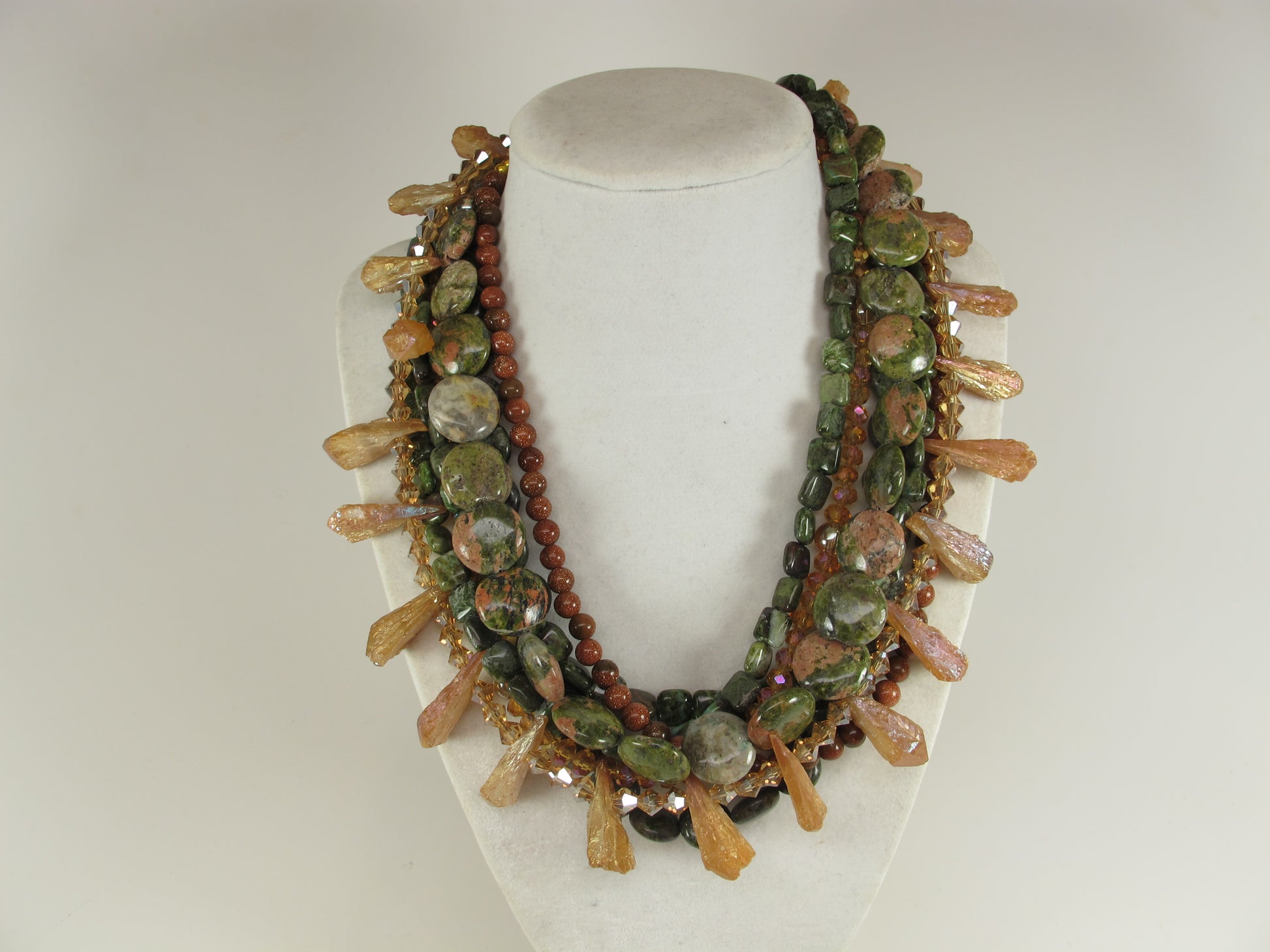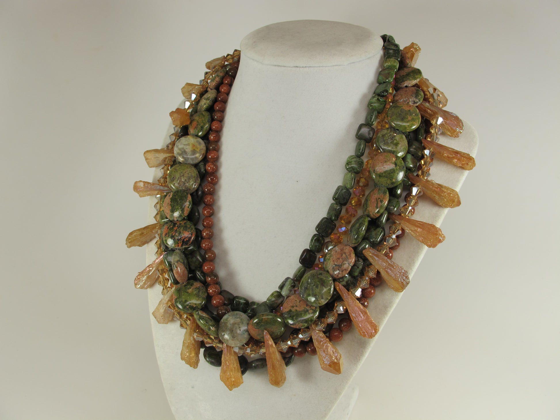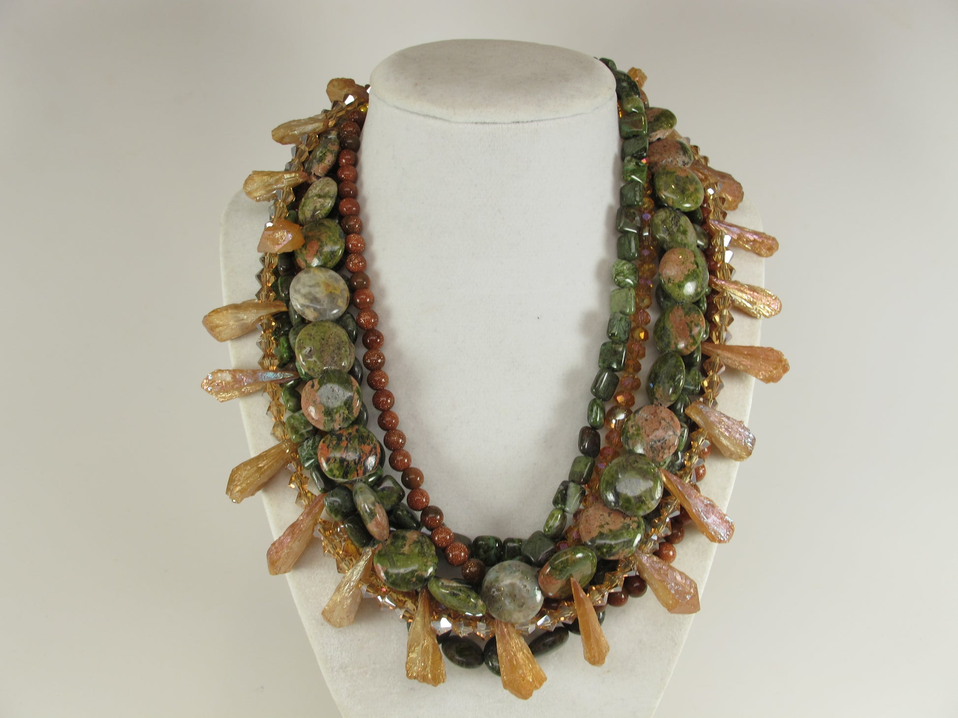 Chunky Green Agate Necklace, Green and brown Necklace, Green Brown Gold Beaded Necklace, Multi Strand Green and GoldStatement Necklace