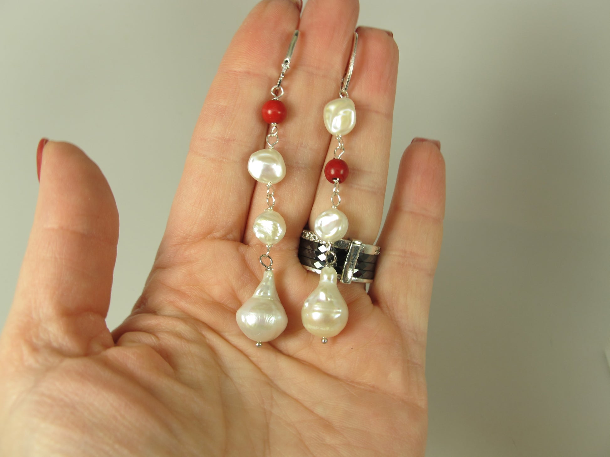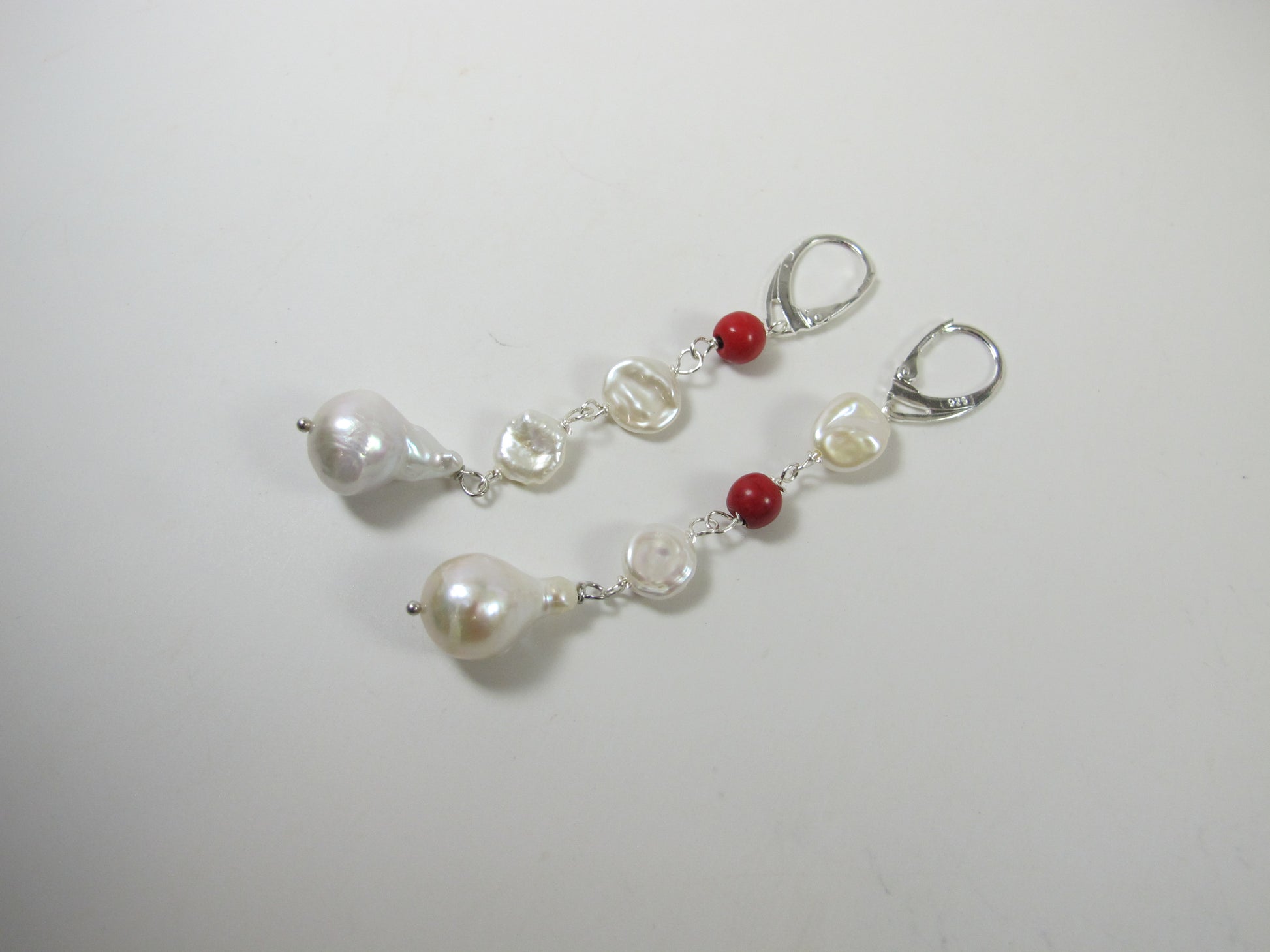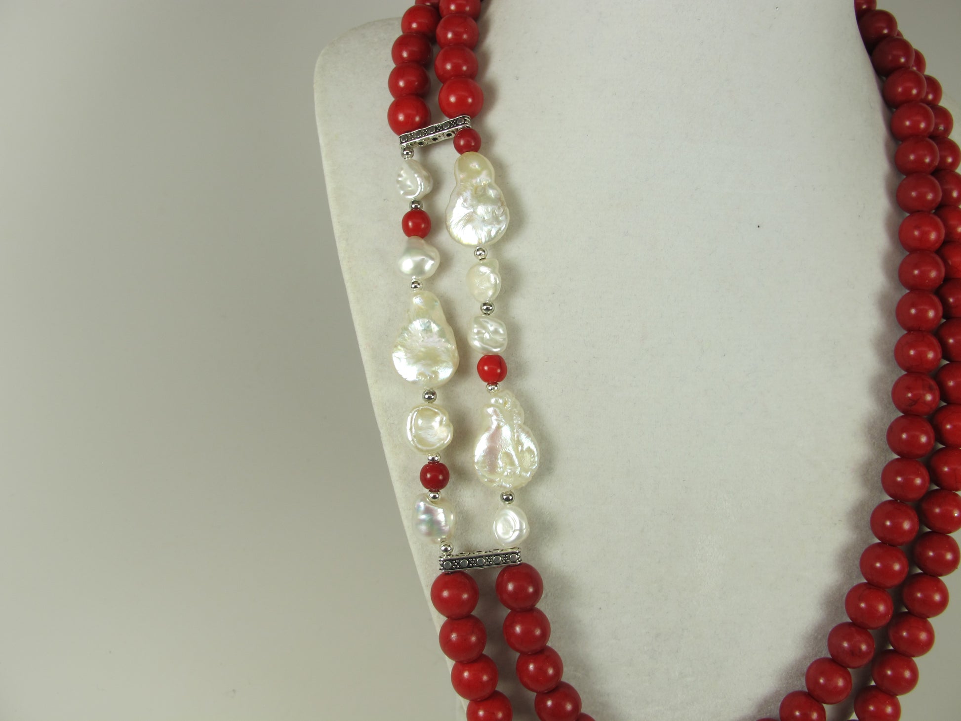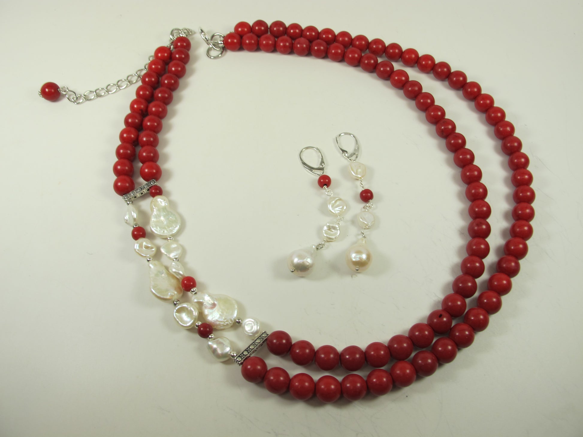 A bold and dramatic statement necklace featuring red turquoise beads and genuine white baroque pearls. 2 strand, light weight. Silver plated lobster clasp. Earrings with sterling silver wire