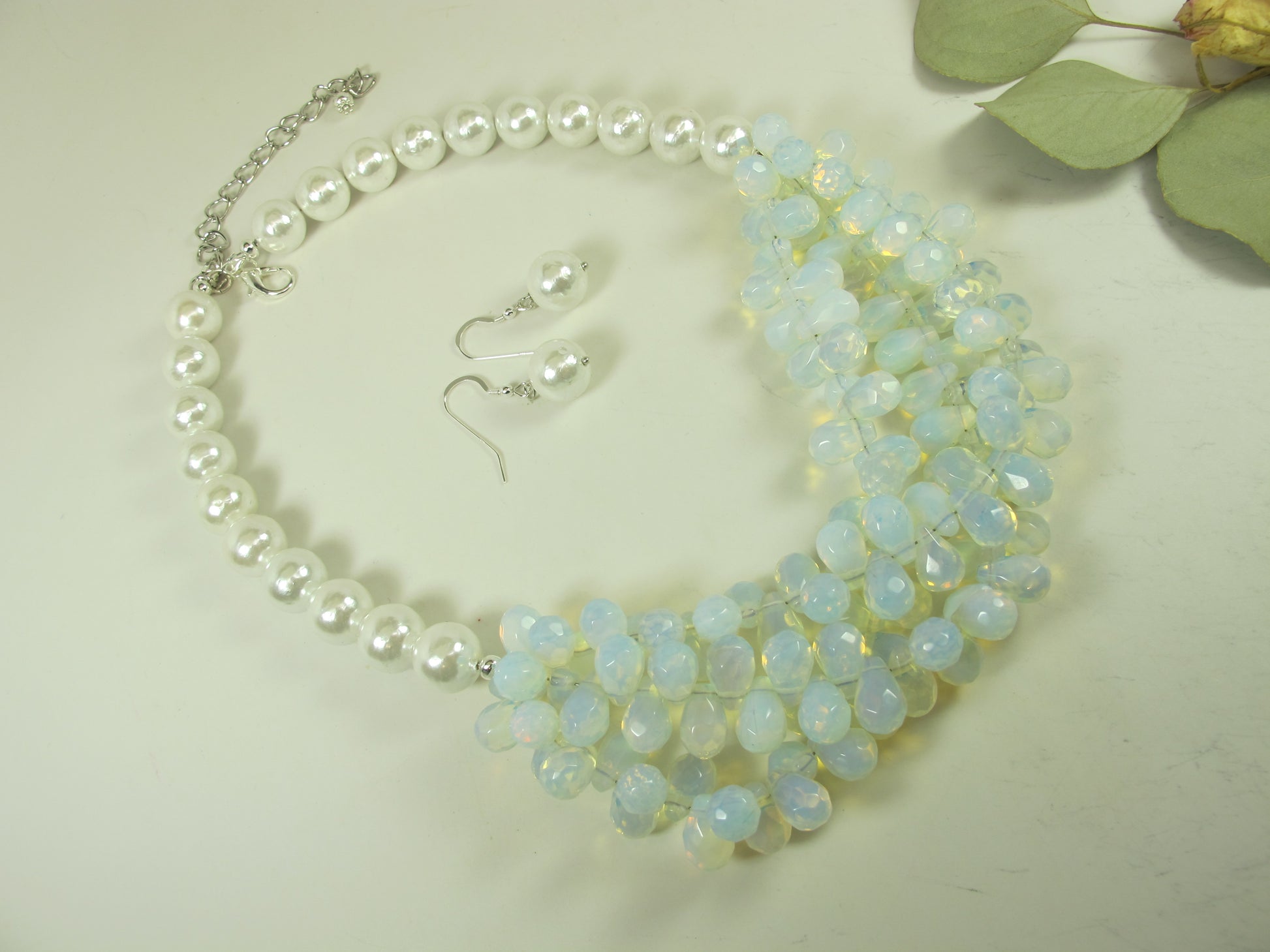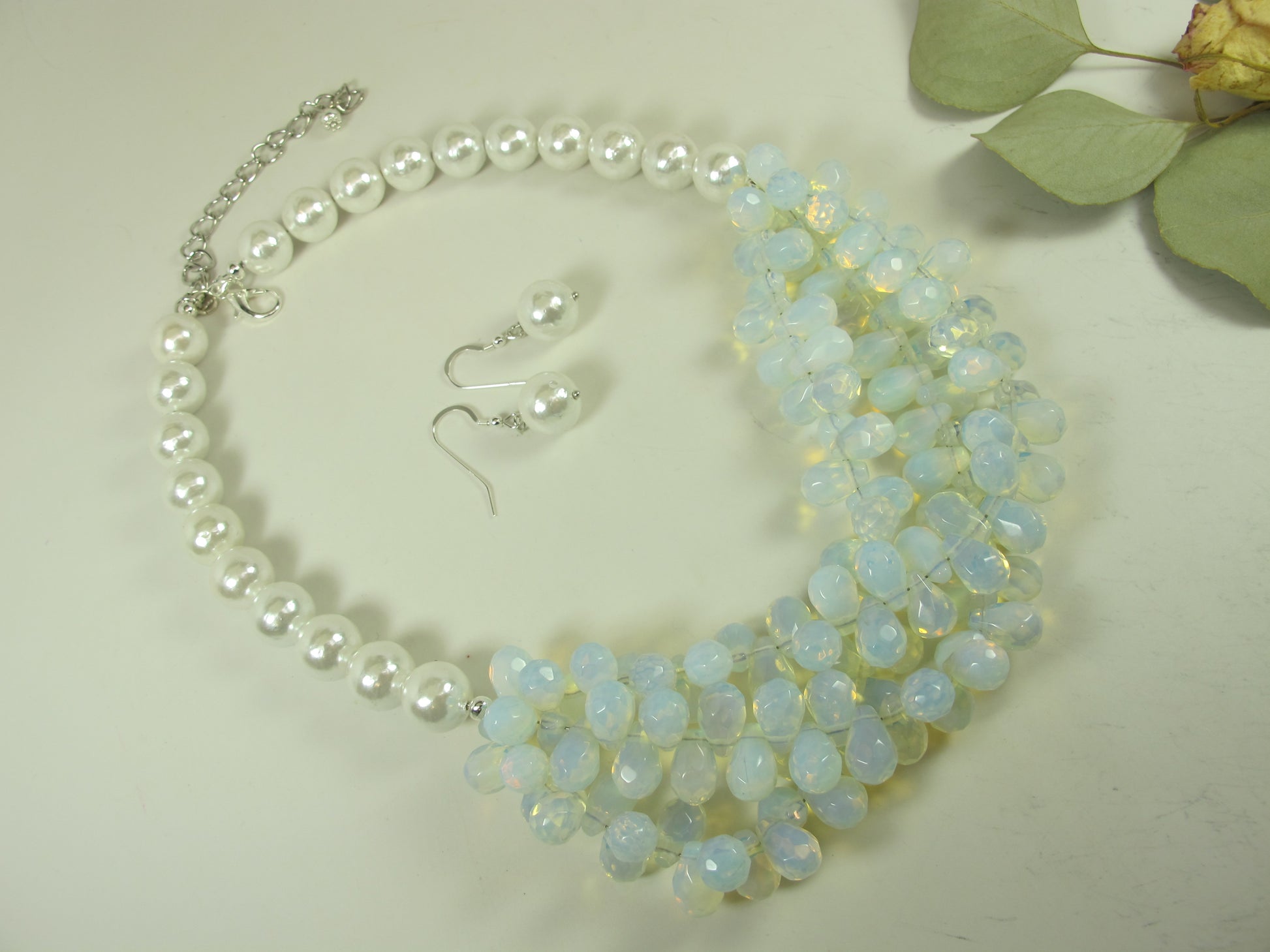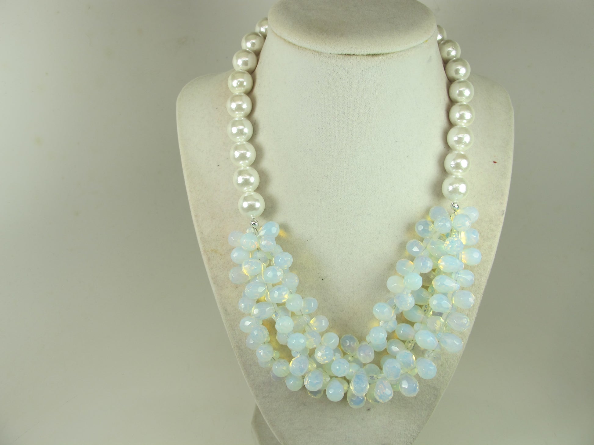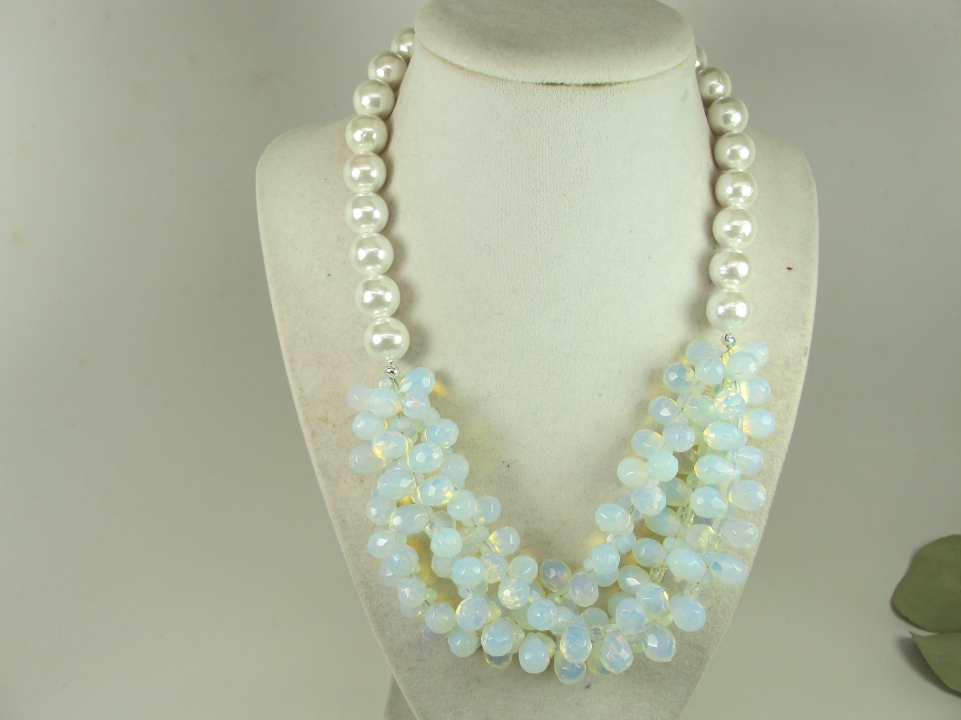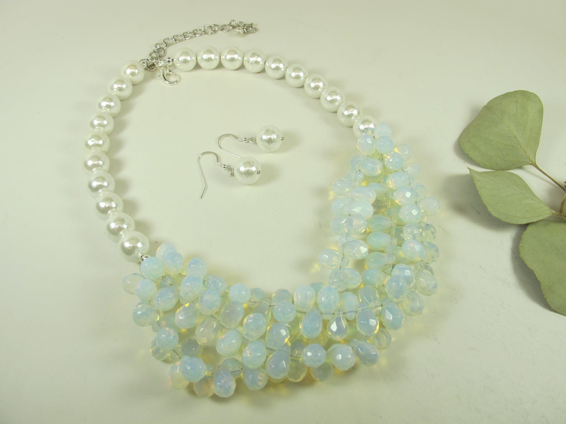 This statement chunky necklace is made from opalite teardrop beads 12mm. Complemented with round white shell pearl 12 mm