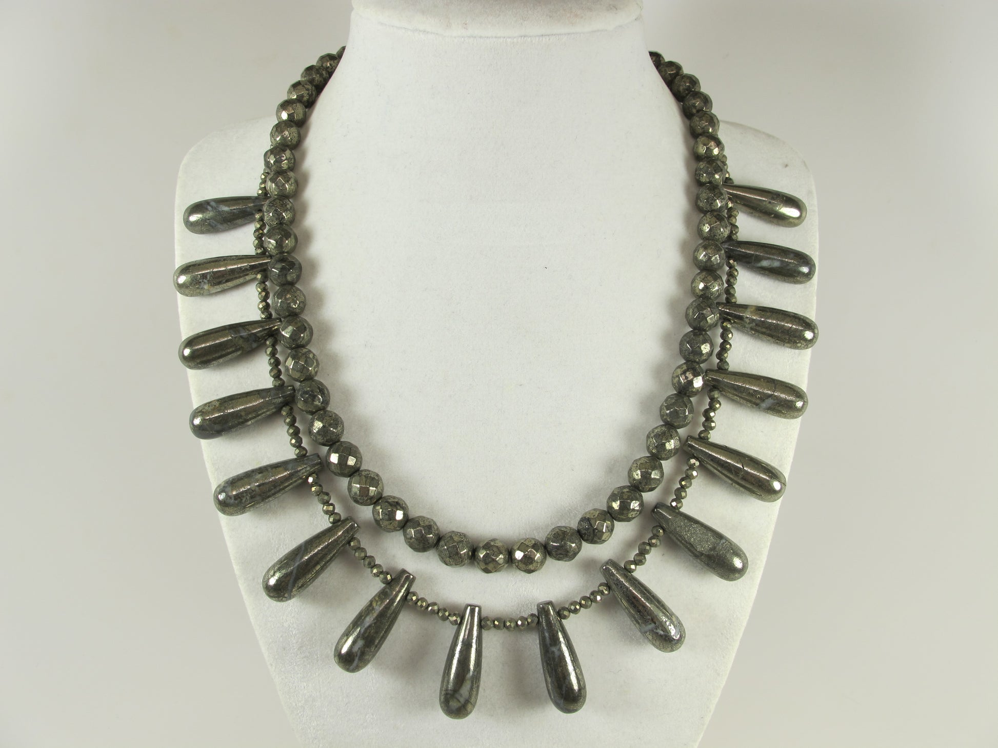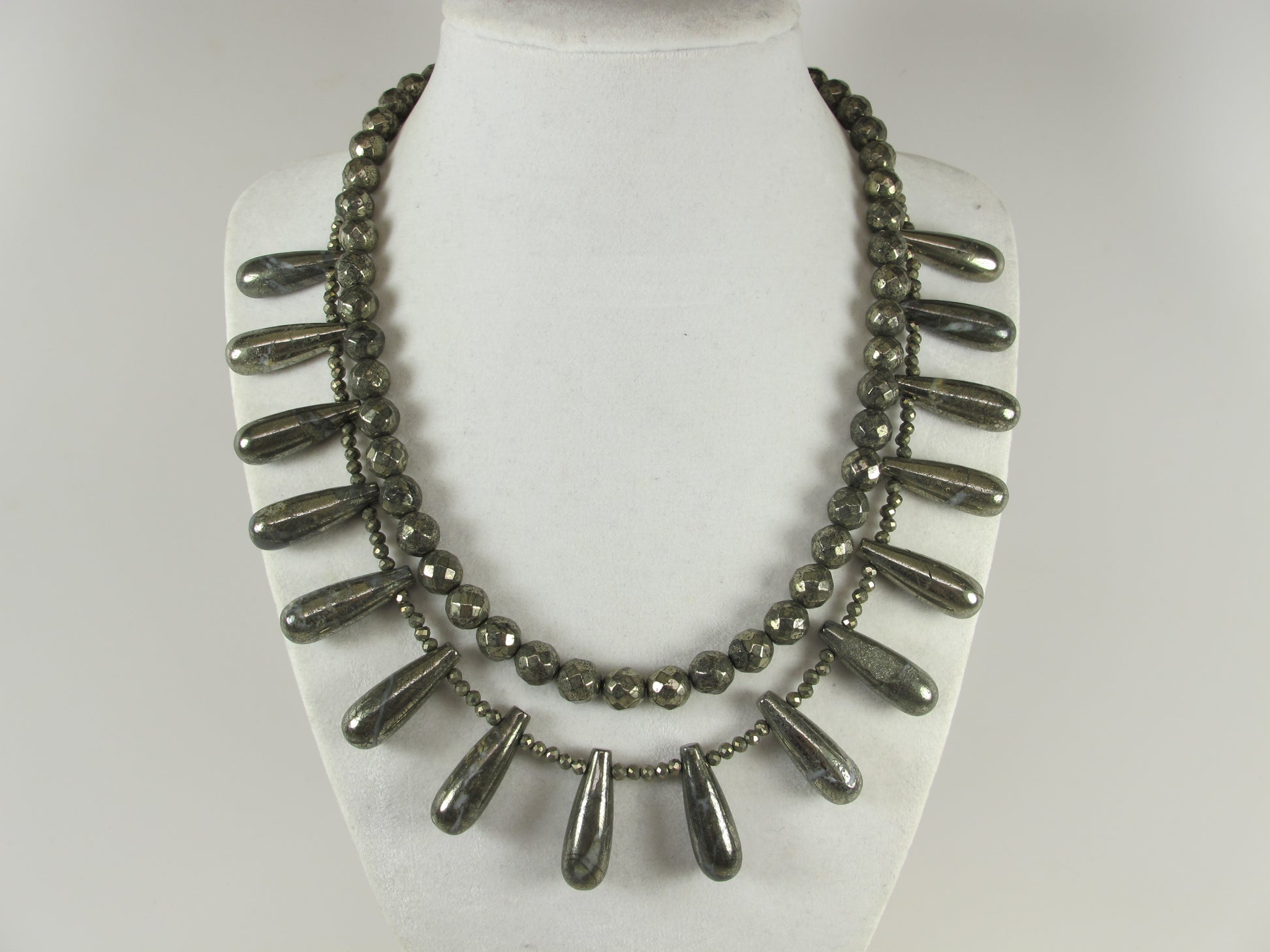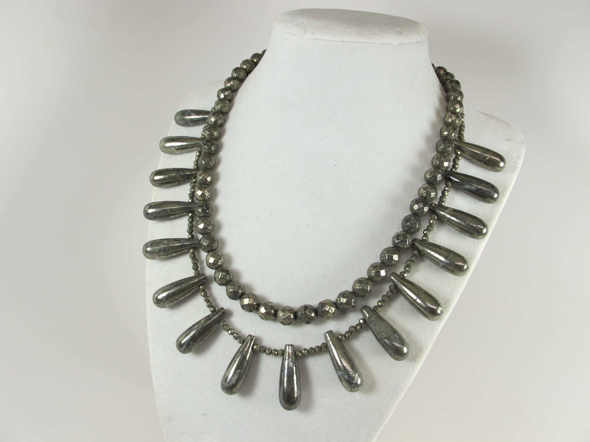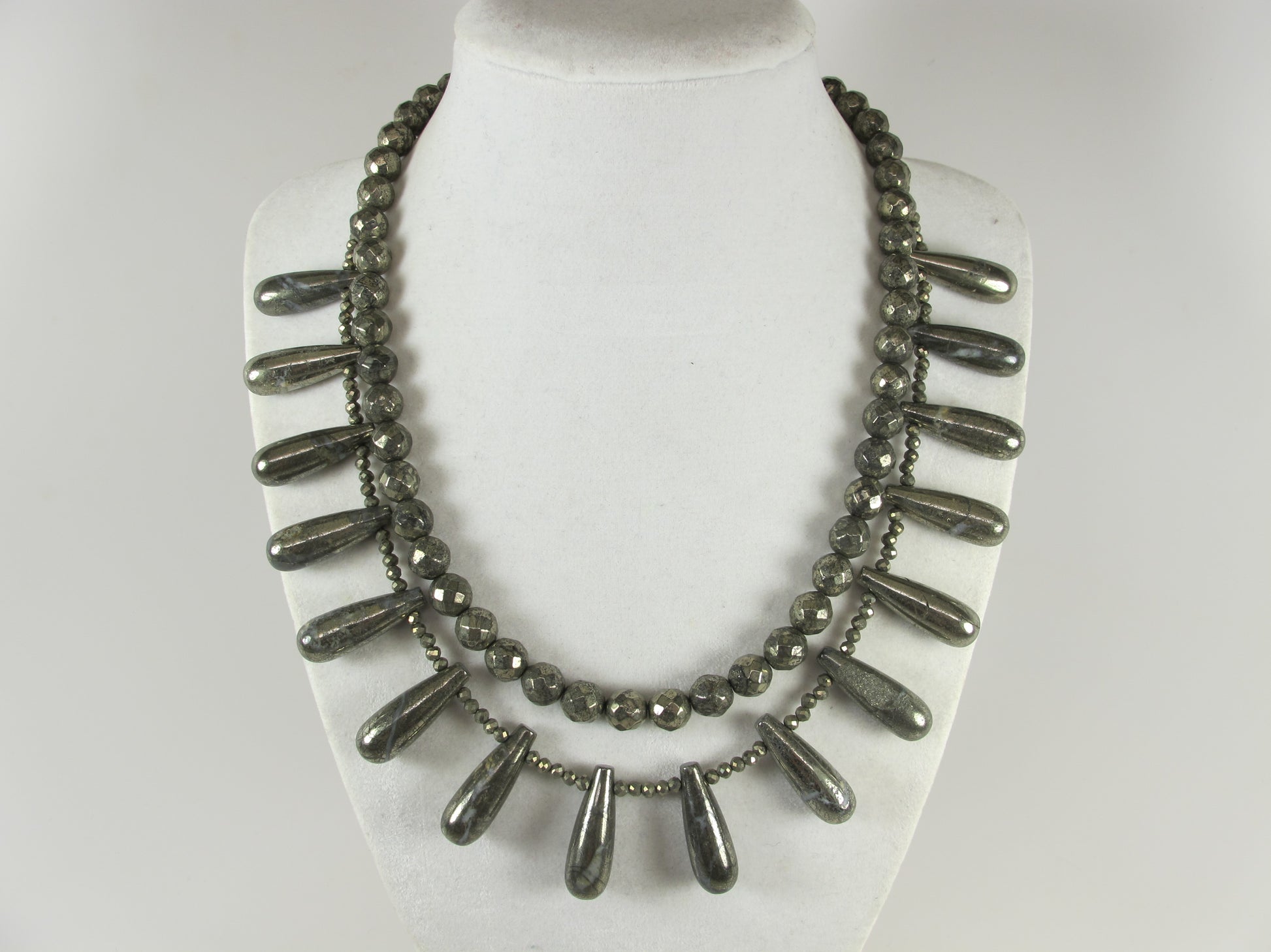 Elegant statement necklace featuring natural pyrite beads. 2 strands, HEAVY weight. Short strand 16" with clasp plus 4" extender. Firs strand is made from 8mm round faceted pyrite beads, long strand is made from 25mmx8mm teardrop pyrite beads with small 3 mm faceted beads. Silver plated lobster clasp and extender chain. Necklace comes with earrings