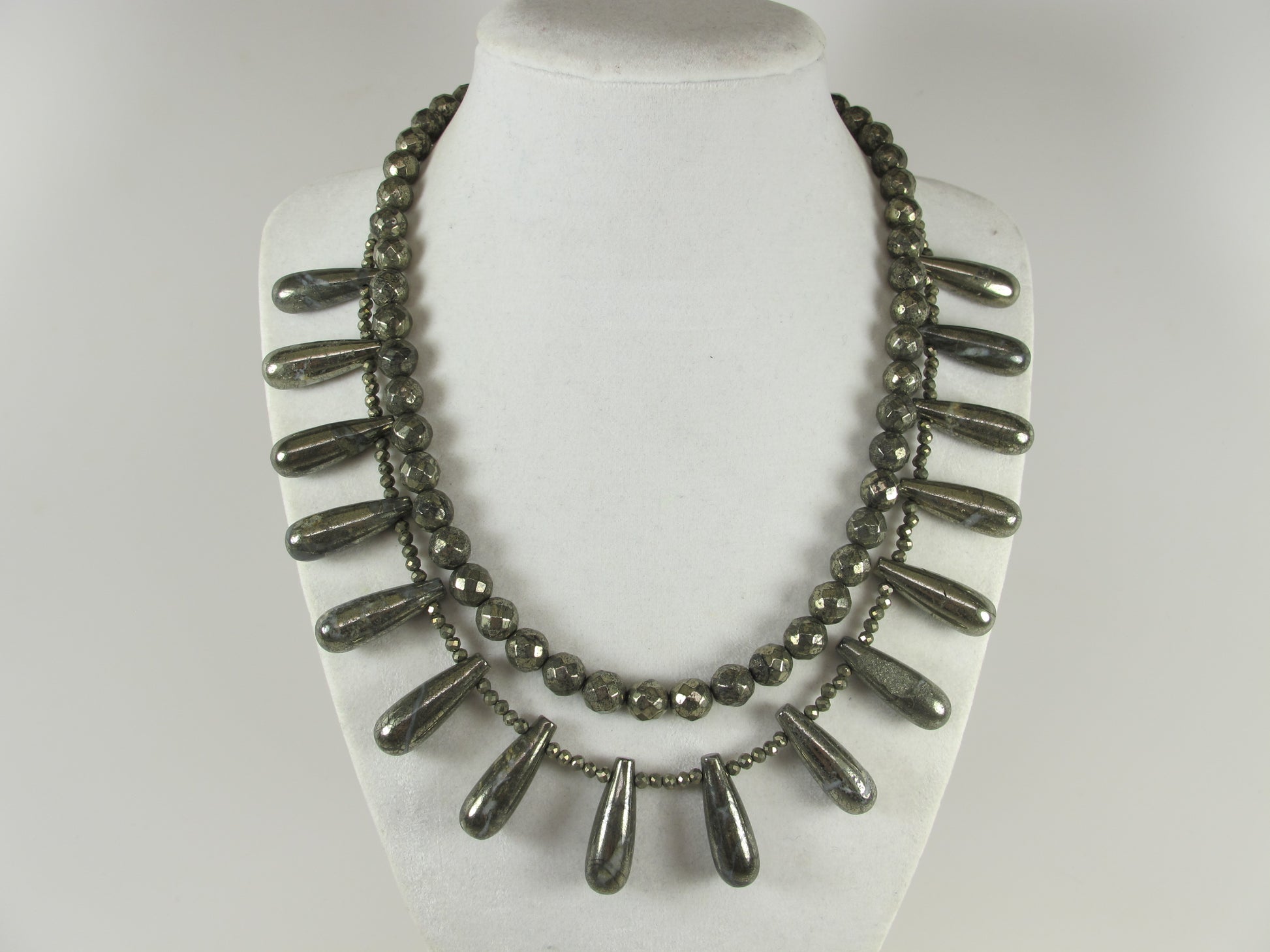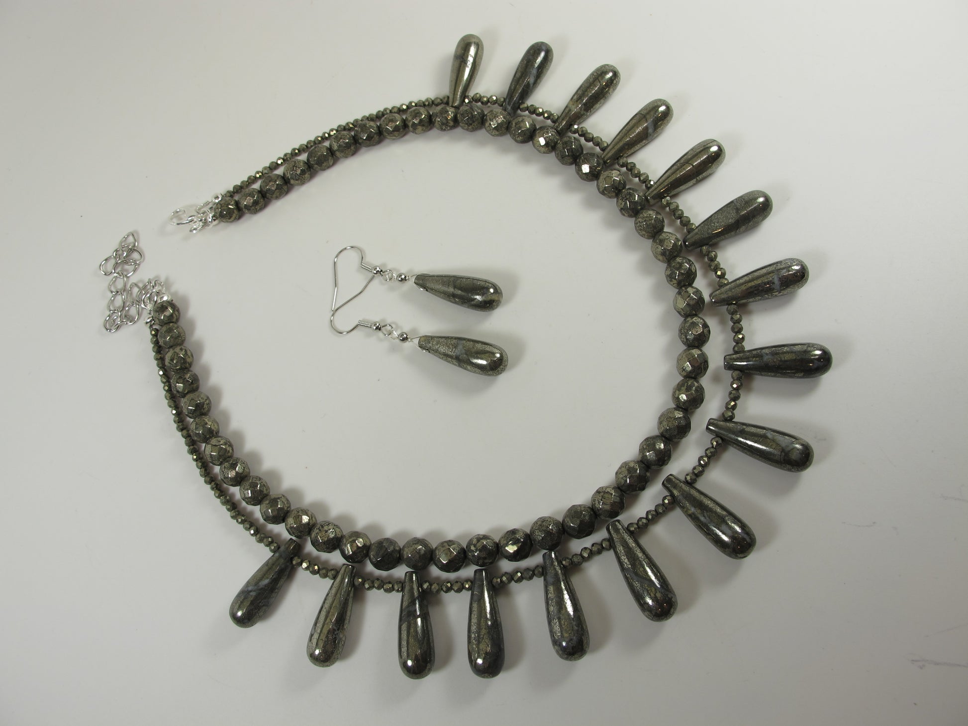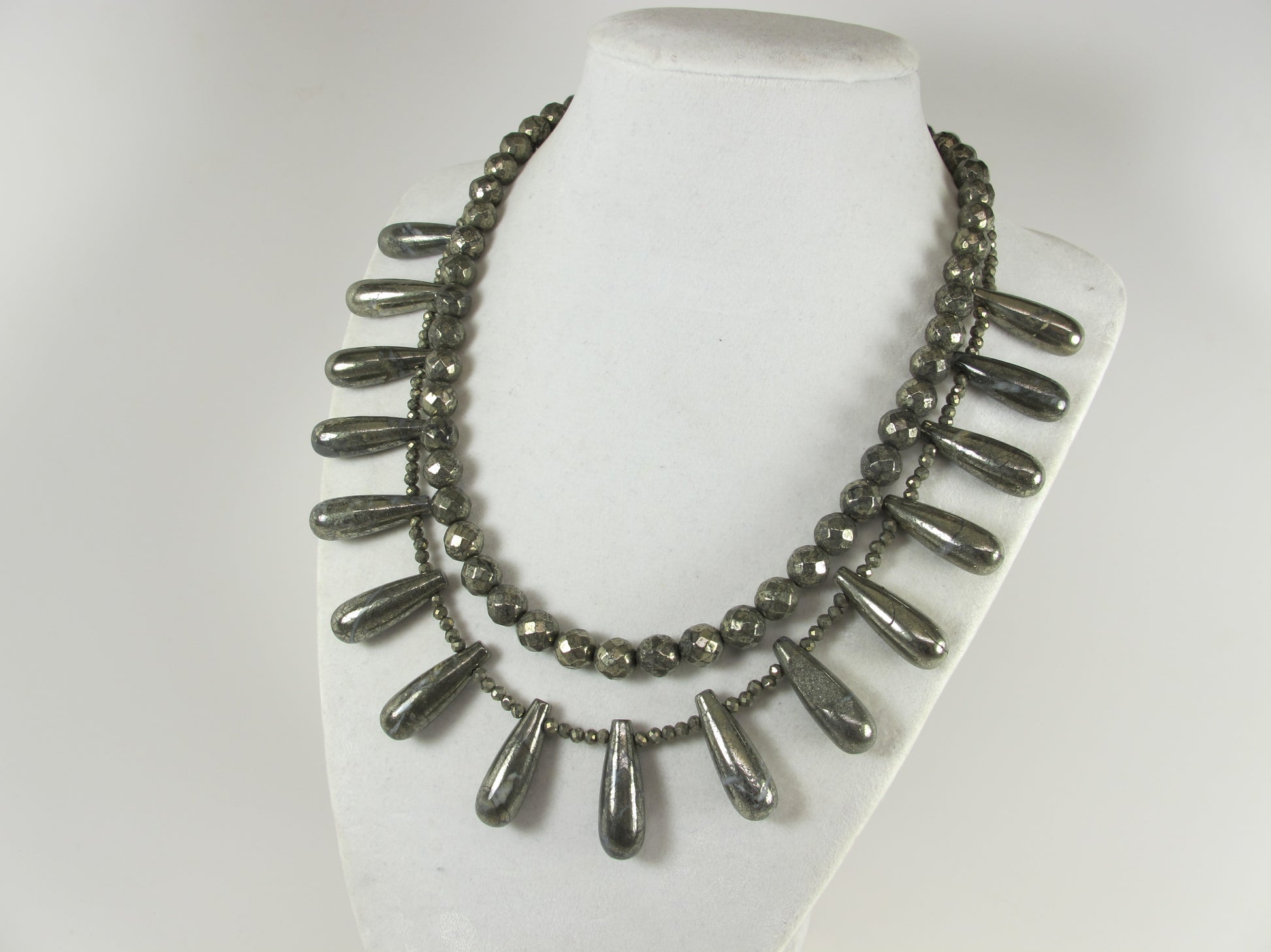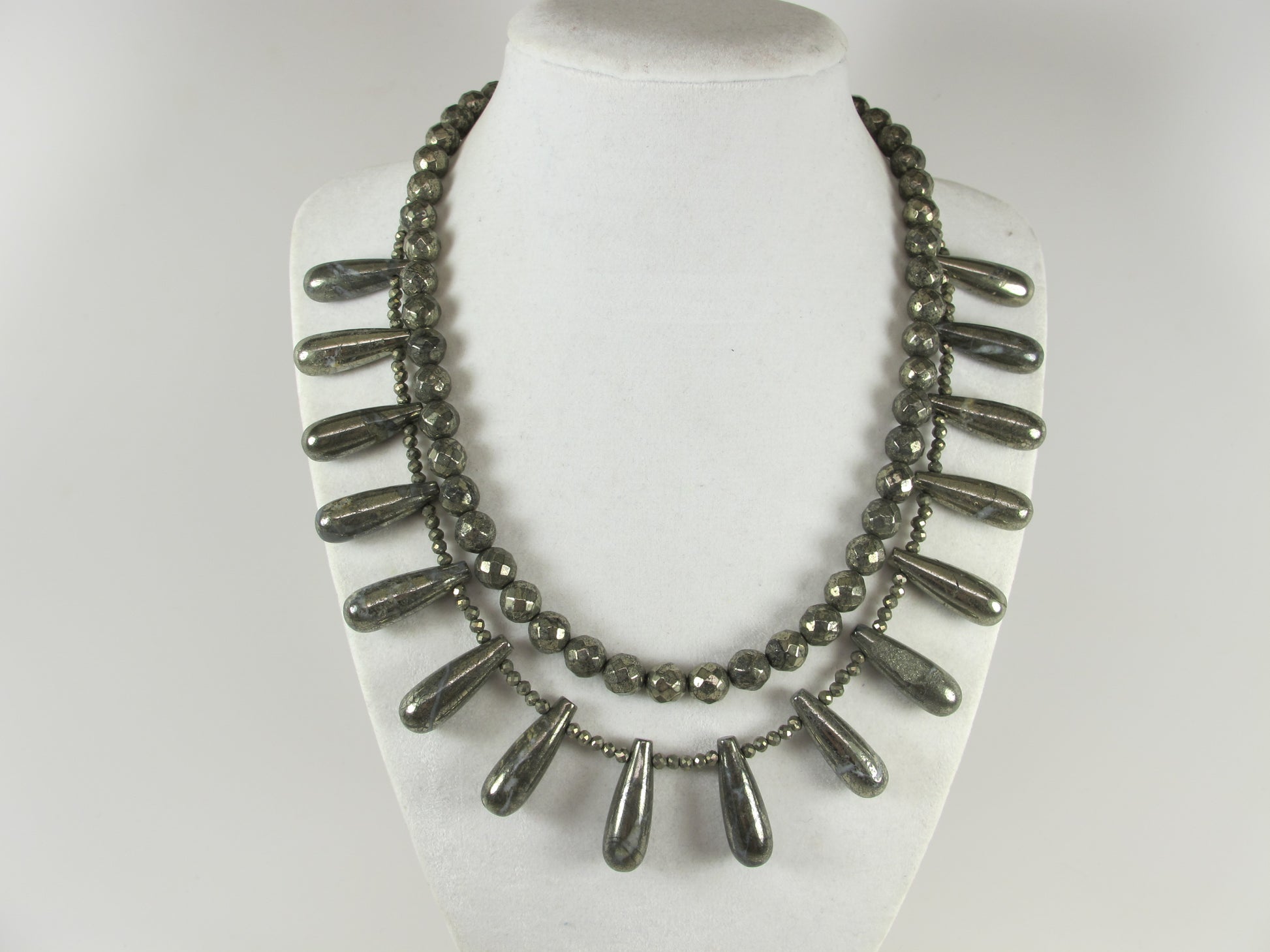 Elegant statement necklace featuring natural pyrite beads. 2 strands, HEAVY weight. Short strand 16" with clasp plus 4" extender. Firs strand is made from 8mm round faceted pyrite beads, long strand is made from 25mmx8mm teardrop pyrite beads with small 3 mm faceted beads. Silver plated lobster clasp and extender chain. Necklace comes with earrings