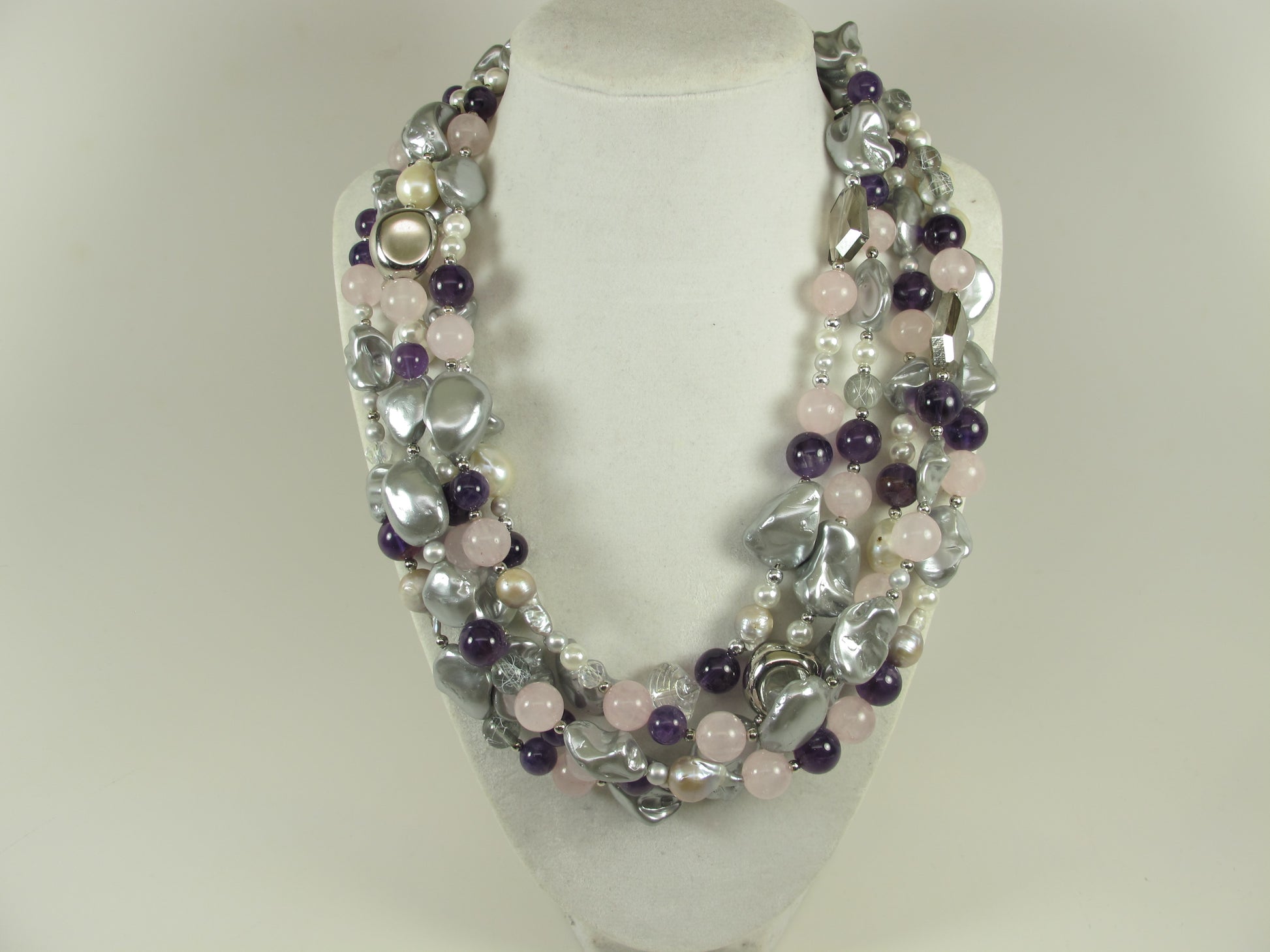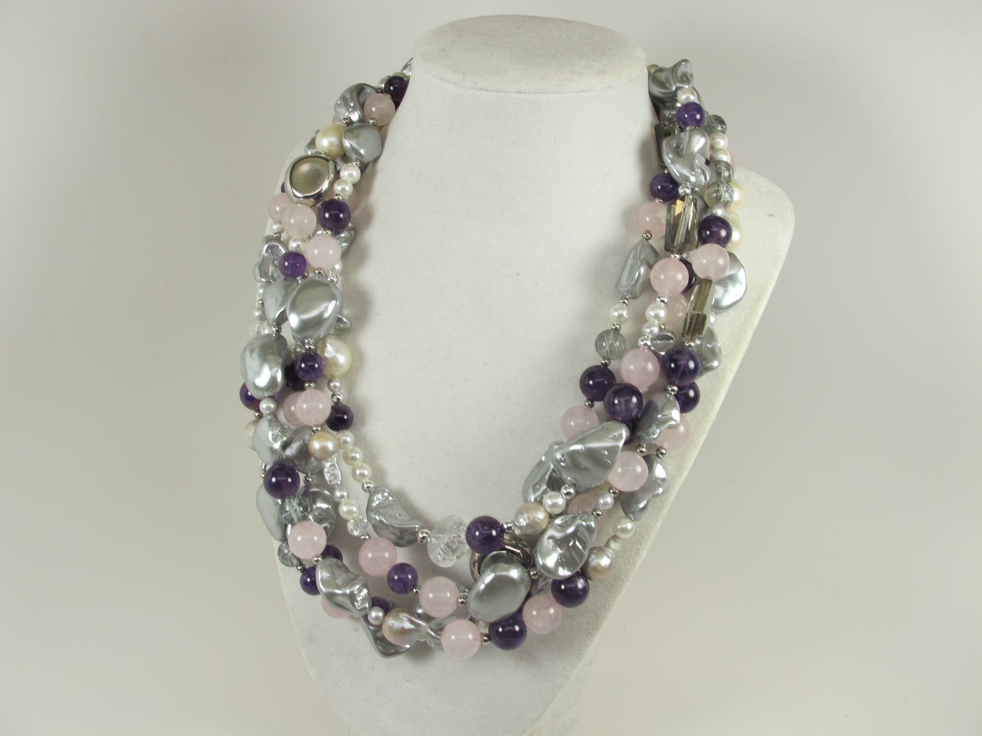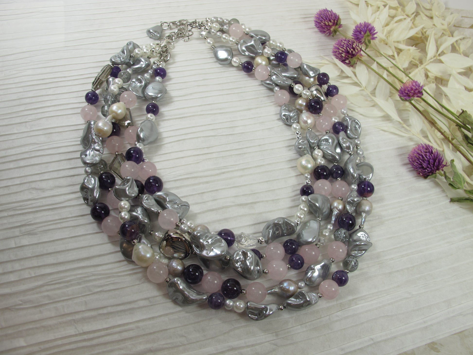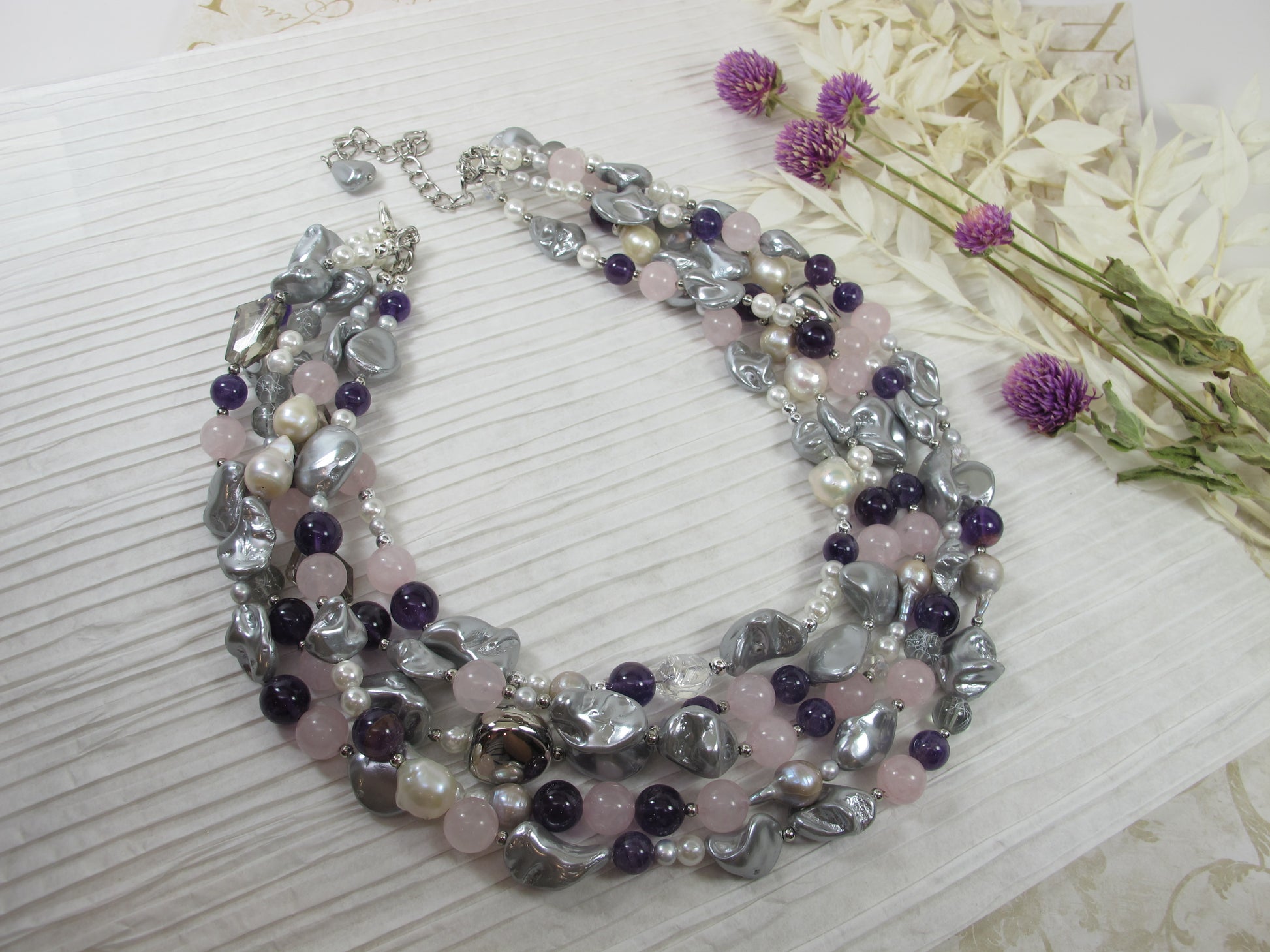 Really stunning, large baroque pearl necklace. The necklace made from SHELL gray baroque beads, round freshwater gray and white pearls, genuine rose quartz and amethyst, glass pearls, silver spacers. 5 strands! HEAVY! Clasp is antique silver plated.