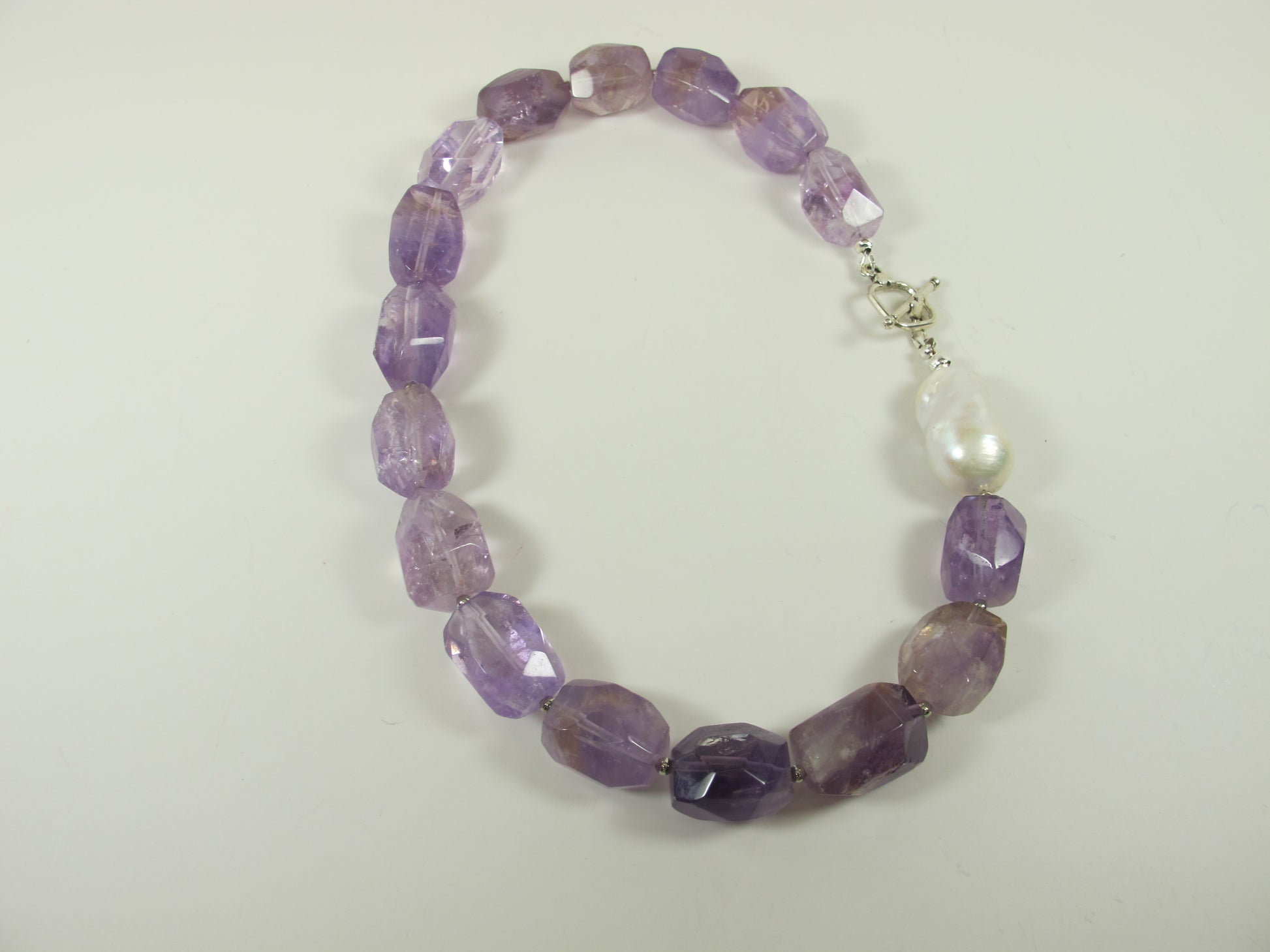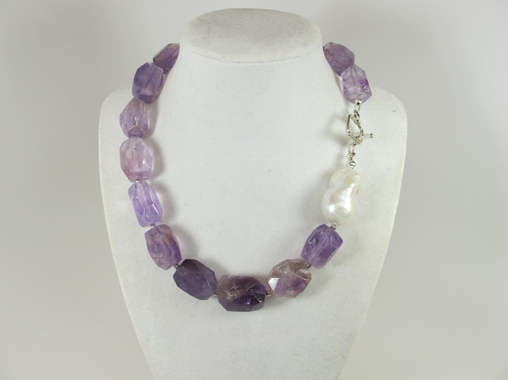A bold and dramatic statement necklace featuring genuine amethyst gemstone beads 20mm x 15 mm and baroque freshwater pearl 30mm x 18mm , medium weight