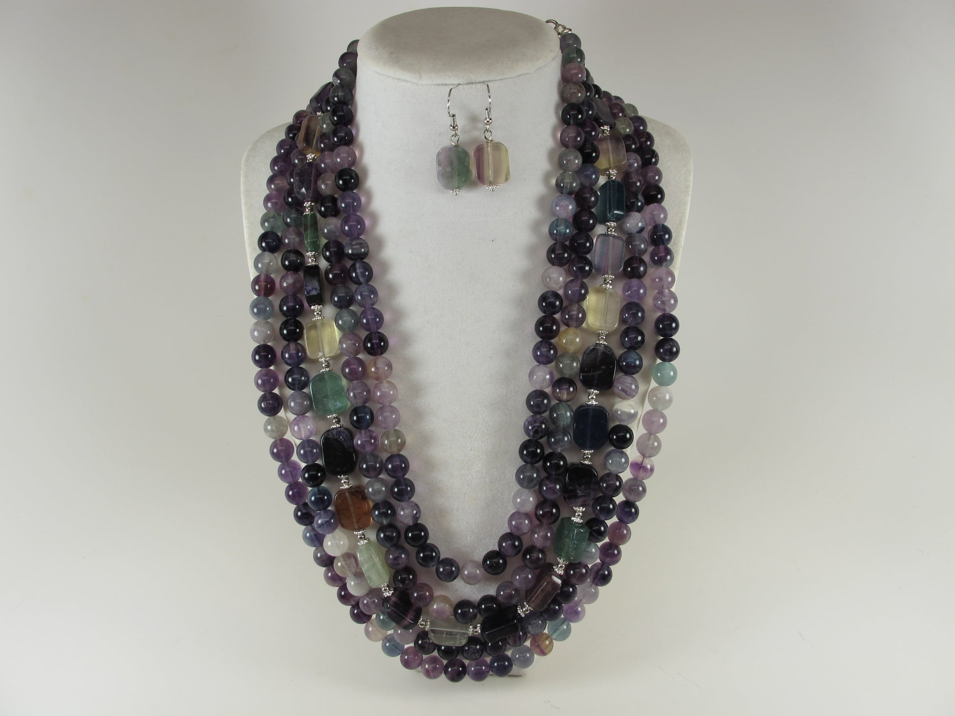 A bold and dramatic statement necklace featuring genuine fluorite beads: round beads 8mm and square beads 15mm x 10mm. 5 strands, very ELEGANT! HEAVY!