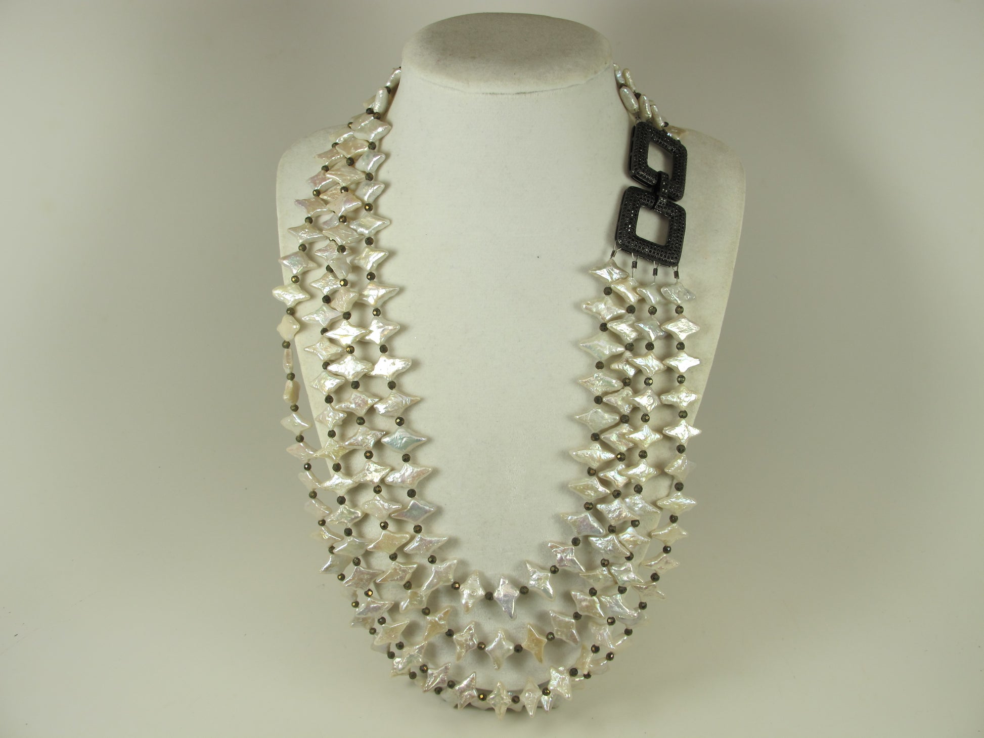 Really stunning, multistrand baroque pearl necklace. black micropaved clasp, 2mm pyrite bronze beads in between.